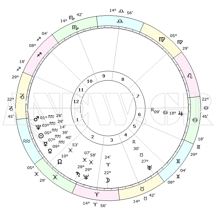 | | ΘΕΣΕΙΣ ΠΛΑΝΗΤΩΝ ΑΣΤΡΟΛΟΓΙΚΟΥ ΧΑΡΤΗ ΤΗΣ ΣΤΙΓΜΗΣ ΑΥΤΗΣ | | | | Πλανήτης | Ζώδιο | Μοίρες | Δεκαήμ. | Σε οίκο | Απόκλιση | | Ακμές των οίκων | | Ηλιος | Υδροχόος | 05°09' | Πρώτο | 1 | 18 S 58 | | 1ος | 28°34' | Τοξότης | | Σελήνη | Κριός | 21°28' | Τρίτο | 4 | 11 N 36 | | 2ος | 05°21' | Υδροχόος | | Ερμής | Υδροχόος | 07°32' | Πρώτο | 2 | 20 S 24 | | 3ος | 15°15' | Ιχθείς | | Αφροδίτη | Υδροχόος | 09°34' | Πρώτο | 2 | 19 S 03 | | 4ος | 19°24' | Κριός | | Αρης | Υδροχόος | 01°23' | Πρώτο | 1 | 20 S 50 | | 5ος | 15°57' | Ταύρος | | Δίας | Καρκίνος | 18°10'R | Δεύτερο | 7 | 22 N 29 | | 6ος | 07°51' | Δίδυμοι | | Κρόνος | Ιχθείς | 28°06' | Τρίτο | 3 | 02 S 46 | | 7ος | 28°34' | Δίδυμοι | | Ουρανός | Ταύρος | 27°30'R | Τρίτο | 5 | 19 N 25 | | 8ος | 05°21' | Λέων | | Ποσειδώνας | Ιχθείς | 29°58' | Τρίτο | 3 | 01 S 13 | | 9ος | 15°15' | Παρθένος | | Πλούτωνας | Υδροχόος | 03°29' | Πρώτο | 1 | 23 S 04 | | 10ος | 19°24' | Ζυγός | | Β. Δεσμός | Ιχθείς | 10°53' | Δεύτερο | 2 | 07 S 29 | | 11ος | 15°57' | Σκορπιός | | Ωροσκόπος | Τοξότης | 28°34' | Τρίτο | | | 12ος | 07°51' | Τοξότης | | Μεσουράνημα | Ζυγός | 19°24' | Δεύτερο | | | |