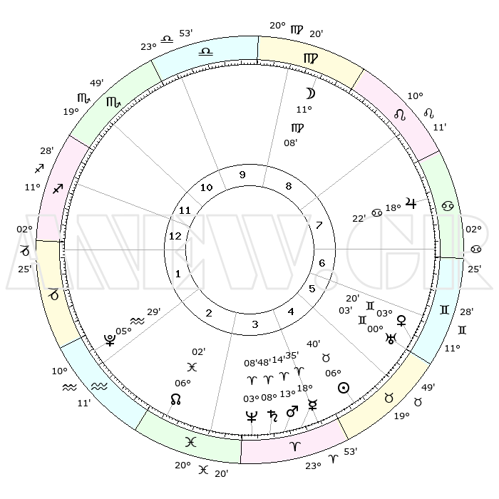 | | ΘΕΣΕΙΣ ΠΛΑΝΗΤΩΝ ΑΣΤΡΟΛΟΓΙΚΟΥ ΧΑΡΤΗ ΤΗΣ ΣΤΙΓΜΗΣ ΑΥΤΗΣ | | | | Πλανήτης | Ζώδιο | Μοίρες | Δεκαήμ. | Σε οίκο | Απόκλιση | | Ακμές των οίκων | | Ηλιος | Ταύρος | 06°37' | Πρώτο | 5 | 13 N 43 | | 1ος | 16°25' | Τοξότης | | Σελήνη | Παρθένος | 10°29' | Δεύτερο | 9 | 07 N 23 | | 2ος | 20°23' | Αιγόκερως | | Ερμής | Κριός | 18°29' | Δεύτερο | 4 | 05 N 07 | | 3ος | 28°49' | Υδροχόος | | Αφροδίτη | Δίδυμοι | 03°16' | Πρώτο | 6 | 21 N 30 | | 4ος | 04°25' | Κριός | | Αρης | Κριός | 13°12' | Δεύτερο | 4 | 04 N 22 | | 5ος | 02°60' | Ταύρος | | Δίας | Καρκίνος | 18°21' | Δεύτερο | 7 | 22 N 34 | | 6ος | 25°59' | Ταύρος | | Κρόνος | Κριός | 08°47' | Πρώτο | 4 | 01 N 30 | | 7ος | 16°25' | Δίδυμοι | | Ουρανός | Δίδυμοι | 00°03' | Πρώτο | 6 | 20 N 00 | | 8ος | 20°23' | Καρκίνος | | Ποσειδώνας | Κριός | 03°08' | Πρώτο | 3 | 00 N 02 | | 9ος | 28°49' | Λέων | | Πλούτωνας | Υδροχόος | 05°29' | Πρώτο | 2 | 22 S 48 | | 10ος | 04°25' | Ζυγός | | Β. Δεσμός | Ιχθείς | 06°02' | Πρώτο | 3 | 09 S 18 | | 11ος | 02°60' | Σκορπιός | | Ωροσκόπος | Τοξότης | 16°25' | Δεύτερο | | | 12ος | 25°59' | Σκορπιός | | Μεσουράνημα | Ζυγός | 04°25' | Πρώτο | | | |