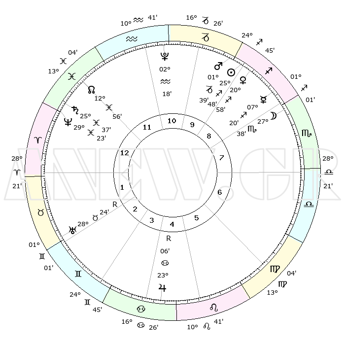 | | ΘΕΣΕΙΣ ΠΛΑΝΗΤΩΝ ΑΣΤΡΟΛΟΓΙΚΟΥ ΧΑΡΤΗ ΤΗΣ ΣΤΙΓΜΗΣ ΑΥΤΗΣ | | | | Πλανήτης | Ζώδιο | Μοίρες | Δεκαήμ. | Σε οίκο | Απόκλιση | | Ακμές των οίκων | | Ηλιος | Τοξότης | 25°43' | Τρίτο | 10 | 23 S 22 | | 1ος | 12°36' | Ιχθείς | | Σελήνη | Σκορπιός | 26°42' | Τρίτο | 8 | 24 S 05 | | 2ος | 26°29' | Κριός | | Ερμής | Τοξότης | 07°13' | Πρώτο | 9 | 20 S 18 | | 3ος | 26°48' | Ταύρος | | Αφροδίτη | Τοξότης | 20°52' | Τρίτο | 10 | 23 S 03 | | 4ος | 20°07' | Δίδυμοι | | Αρης | Αιγόκερως | 01°36' | Πρώτο | 10 | 24 S 13 | | 5ος | 11°53' | Καρκίνος | | Δίας | Καρκίνος | 23°07'R | Τρίτο | 5 | 21 N 39 | | 6ος | 06°52' | Λέων | | Κρόνος | Ιχθείς | 25°37' | Τρίτο | 1 | 03 S 52 | | 7ος | 12°36' | Παρθένος | | Ουρανός | Ταύρος | 28°24'R | Τρίτο | 3 | 19 N 36 | | 8ος | 26°29' | Ζυγός | | Ποσειδώνας | Ιχθείς | 29°23' | Τρίτο | 1 | 01 S 29 | | 9ος | 26°48' | Σκορπιός | | Πλούτωνας | Υδροχόος | 02°18' | Πρώτο | 11 | 23 S 19 | | 10ος | 20°07' | Τοξότης | | Β. Δεσμός | Ιχθείς | 12°57' | Δεύτερο | 1 | 06 S 42 | | 11ος | 11°53' | Αιγόκερως | | Ωροσκόπος | Ιχθείς | 12°36' | Δεύτερο | | | 12ος | 06°52' | Υδροχόος | | Μεσουράνημα | Τοξότης | 20°07' | Τρίτο | | | |