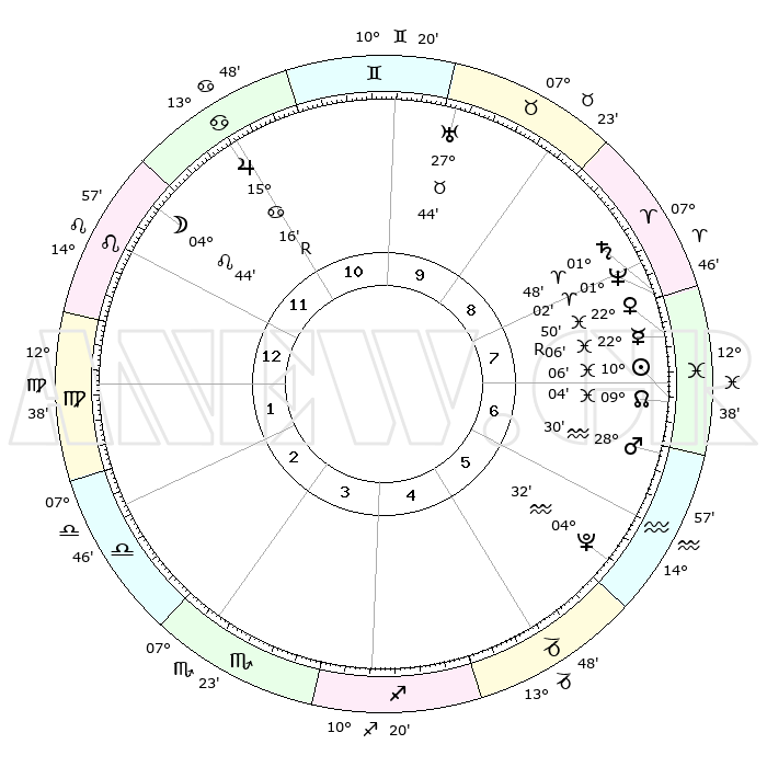 | | ΘΕΣΕΙΣ ΠΛΑΝΗΤΩΝ ΑΣΤΡΟΛΟΓΙΚΟΥ ΧΑΡΤΗ ΤΗΣ ΣΤΙΓΜΗΣ ΑΥΤΗΣ | | | | Πλανήτης | Ζώδιο | Μοίρες | Δεκαήμ. | Σε οίκο | Απόκλιση | | Ακμές των οίκων | | Ηλιος | Ιχθείς | 10°02' | Δεύτερο | 7 | 07 S 48 | | 1ος | 24°00' | Λέων | | Σελήνη | Λέων | 03°51' | Πρώτο | 12 | 22 N 15 | | 2ος | 17°13' | Παρθένος | | Ερμής | Ιχθείς | 22°08'R | Τρίτο | 8 | 00 S 09 | | 3ος | 15°18' | Ζυγός | | Αφροδίτη | Ιχθείς | 22°45' | Τρίτο | 8 | 04 S 08 | | 4ος | 18°07' | Σκορπιός | | Αρης | Υδροχόος | 28°27' | Τρίτο | 7 | 13 S 02 | | 5ος | 22°44' | Τοξότης | | Δίας | Καρκίνος | 15°16'R | Δεύτερο | 11 | 22 N 54 | | 6ος | 25°13' | Αιγόκερως | | Κρόνος | Κριός | 01°48' | Πρώτο | 8 | 01 S 15 | | 7ος | 24°00' | Υδροχόος | | Ουρανός | Ταύρος | 27°43' | Τρίτο | 10 | 19 N 28 | | 8ος | 17°14' | Ιχθείς | | Ποσειδώνας | Κριός | 01°02' | Πρώτο | 8 | 00 S 47 | | 9ος | 15°18' | Κριός | | Πλούτωνας | Υδροχόος | 04°32' | Πρώτο | 6 | 22 S 53 | | 10ος | 18°07' | Ταύρος | | Β. Δεσμός | Ιχθείς | 09°04' | Πρώτο | 7 | 08 S 10 | | 11ος | 22°44' | Δίδυμοι | | Ωροσκόπος | Λέων | 24°00' | Τρίτο | | | 12ος | 25°13' | Καρκίνος | | Μεσουράνημα | Ταύρος | 18°07' | Δεύτερο | | | |