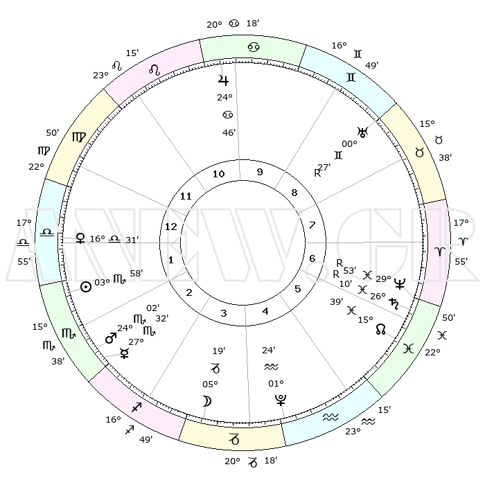 | | ΘΕΣΕΙΣ ΠΛΑΝΗΤΩΝ ΑΣΤΡΟΛΟΓΙΚΟΥ ΧΑΡΤΗ ΤΗΣ ΣΤΙΓΜΗΣ ΑΥΤΗΣ | | | | Πλανήτης | Ζώδιο | Μοίρες | Δεκαήμ. | Σε οίκο | Απόκλιση | | Ακμές των οίκων | | Ηλιος | Σκορπιός | 03°52' | Πρώτο | 2 | 12 S 48 | | 1ος | 15°48' | Παρθένος | | Σελήνη | Αιγόκερως | 03°60' | Πρώτο | 4 | 28 S 17 | | 2ος | 11°14' | Ζυγός | | Ερμής | Σκορπιός | 27°25' | Τρίτο | 3 | 22 S 15 | | 3ος | 11°02' | Σκορπιός | | Αφροδίτη | Ζυγός | 16°23' | Δεύτερο | 2 | 05 S 02 | | 4ος | 13°58' | Τοξότης | | Αρης | Σκορπιός | 23°57' | Τρίτο | 3 | 19 S 05 | | 5ος | 17°18' | Αιγόκερως | | Δίας | Καρκίνος | 24°45' | Τρίτο | 11 | 21 N 15 | | 6ος | 18°18' | Υδροχόος | | Κρόνος | Ιχθείς | 26°10'R | Τρίτο | 7 | 03 S 48 | | 7ος | 15°48' | Ιχθείς | | Ουρανός | Δίδυμοι | 00°27'R | Πρώτο | 9 | 20 N 02 | | 8ος | 11°14' | Κριός | | Ποσειδώνας | Ιχθείς | 29°54'R | Τρίτο | 7 | 01 S 18 | | 9ος | 11°02' | Ταύρος | | Πλούτωνας | Υδροχόος | 01°24' | Πρώτο | 5 | 23 S 31 | | 10ος | 13°58' | Δίδυμοι | | Β. Δεσμός | Ιχθείς | 15°40' | Δεύτερο | 6 | 05 S 39 | | 11ος | 17°18' | Καρκίνος | | Ωροσκόπος | Παρθένος | 15°48' | Δεύτερο | | | 12ος | 18°18' | Λέων | | Μεσουράνημα | Δίδυμοι | 13°58' | Δεύτερο | | | |