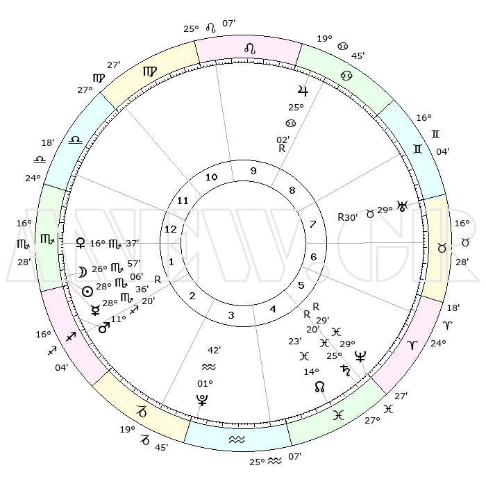 | | ΘΕΣΕΙΣ ΠΛΑΝΗΤΩΝ ΑΣΤΡΟΛΟΓΙΚΟΥ ΧΑΡΤΗ ΤΗΣ ΣΤΙΓΜΗΣ ΑΥΤΗΣ | | | | Πλανήτης | Ζώδιο | Μοίρες | Δεκαήμ. | Σε οίκο | Απόκλιση | | Ακμές των οίκων | | Ηλιος | Σκορπιός | 28°01' | Τρίτο | 2 | 19 S 43 | | 1ος | 25°43' | Ζυγός | | Σελήνη | Σκορπιός | 26°06' | Τρίτο | 2 | 23 S 52 | | 2ος | 23°52' | Σκορπιός | | Ερμής | Σκορπιός | 28°42'R | Τρίτο | 2 | 19 S 26 | | 3ος | 25°31' | Τοξότης | | Αφροδίτη | Σκορπιός | 16°31' | Δεύτερο | 1 | 15 S 45 | | 4ος | 29°25' | Αιγόκερως | | Αρης | Τοξότης | 11°17' | Δεύτερο | 2 | 22 S 41 | | 5ος | 02°22' | Ιχθείς | | Δίας | Καρκίνος | 25°02'R | Τρίτο | 9 | 21 N 15 | | 6ος | 01°25' | Κριός | | Κρόνος | Ιχθείς | 25°20'R | Τρίτο | 5 | 04 S 04 | | 7ος | 25°43' | Κριός | | Ουρανός | Ταύρος | 29°30'R | Τρίτο | 8 | 19 N 50 | | 8ος | 23°52' | Ταύρος | | Ποσειδώνας | Ιχθείς | 29°29'R | Τρίτο | 5 | 01 S 27 | | 9ος | 25°31' | Δίδυμοι | | Πλούτωνας | Υδροχόος | 01°42' | Πρώτο | 4 | 23 S 27 | | 10ος | 29°25' | Καρκίνος | | Β. Δεσμός | Ιχθείς | 14°23' | Δεύτερο | 5 | 06 S 09 | | 11ος | 02°22' | Παρθένος | | Ωροσκόπος | Ζυγός | 25°43' | Τρίτο | | | 12ος | 01°25' | Ζυγός | | Μεσουράνημα | Καρκίνος | 29°25' | Τρίτο | | | |