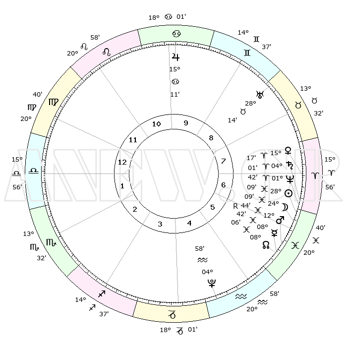| | ΘΕΣΕΙΣ ΠΛΑΝΗΤΩΝ ΑΣΤΡΟΛΟΓΙΚΟΥ ΧΑΡΤΗ ΤΗΣ ΣΤΙΓΜΗΣ ΑΥΤΗΣ | | | | Πλανήτης | Ζώδιο | Μοίρες | Δεκαήμ. | Σε οίκο | Απόκλιση | | Ακμές των οίκων | | Ηλιος | Ιχθείς | 28°05' | Τρίτο | 7 | 00 S 46 | | 1ος | 24°39' | Παρθένος | | Σελήνη | Ιχθείς | 23°09' | Τρίτο | 6 | 01 S 32 | | 2ος | 20°50' | Ζυγός | | Ερμής | Ιχθείς | 08°43'R | Πρώτο | 6 | 06 S 54 | | 3ος | 21°03' | Σκορπιός | | Αφροδίτη | Κριός | 15°12' | Δεύτερο | 7 | 05 N 07 | | 4ος | 23°59' | Τοξότης | | Αρης | Ιχθείς | 12°40' | Δεύτερο | 6 | 07 S 48 | | 5ος | 27°03' | Αιγόκερως | | Δίας | Καρκίνος | 15°11' | Δεύτερο | 10 | 22 N 56 | | 6ος | 27°41' | Υδροχόος | | Κρόνος | Κριός | 04°00' | Πρώτο | 7 | 00 S 22 | | 7ος | 24°39' | Ιχθείς | | Ουρανός | Ταύρος | 28°14' | Τρίτο | 9 | 19 N 36 | | 8ος | 20°50' | Κριός | | Ποσειδώνας | Κριός | 01°42' | Πρώτο | 7 | 00 S 31 | | 9ος | 21°03' | Ταύρος | | Πλούτωνας | Υδροχόος | 04°58' | Πρώτο | 5 | 22 S 49 | | 10ος | 23°59' | Δίδυμοι | | Β. Δεσμός | Ιχθείς | 08°07' | Πρώτο | 6 | 08 S 32 | | 11ος | 27°03' | Καρκίνος | | Ωροσκόπος | Παρθένος | 24°39' | Τρίτο | | | 12ος | 27°41' | Λέων | | Μεσουράνημα | Δίδυμοι | 23°59' | Τρίτο | | | |