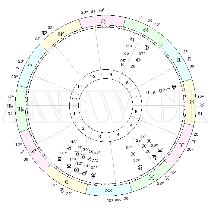 | | ΘΕΣΕΙΣ ΠΛΑΝΗΤΩΝ ΑΣΤΡΟΛΟΓΙΚΟΥ ΧΑΡΤΗ ΤΗΣ ΣΤΙΓΜΗΣ ΑΥΤΗΣ | | | | Πλανήτης | Ζώδιο | Μοίρες | Δεκαήμ. | Σε οίκο | Απόκλιση | | Ακμές των οίκων | | Ηλιος | Αιγόκερως | 12°35' | Δεύτερο | 3 | 22 S 50 | | 1ος | 24°05' | Ζυγός | | Σελήνη | Καρκίνος | 06°30' | Πρώτο | 9 | 27 N 50 | | 2ος | 22°09' | Σκορπιός | | Ερμής | Αιγόκερως | 01°42' | Πρώτο | 3 | 24 S 12 | | 3ος | 23°41' | Τοξότης | | Αφροδίτη | Αιγόκερως | 11°43' | Δεύτερο | 3 | 23 S 30 | | 4ος | 27°30' | Αιγόκερως | | Αρης | Αιγόκερως | 14°13' | Δεύτερο | 3 | 23 S 34 | | 5ος | 00°27' | Ιχθείς | | Δίας | Καρκίνος | 21°06'R | Τρίτο | 9 | 22 N 01 | | 6ος | 29°37' | Ιχθείς | | Κρόνος | Ιχθείς | 26°24' | Τρίτο | 5 | 03 S 30 | | 7ος | 24°05' | Κριός | | Ουρανός | Ταύρος | 27°53'R | Τρίτο | 8 | 19 N 30 | | 8ος | 22°09' | Ταύρος | | Ποσειδώνας | Ιχθείς | 29°32' | Τρίτο | 5 | 01 S 24 | | 9ος | 23°41' | Δίδυμοι | | Πλούτωνας | Υδροχόος | 02°47' | Πρώτο | 4 | 23 S 12 | | 10ος | 27°30' | Καρκίνος | | Β. Δεσμός | Ιχθείς | 12°04' | Δεύτερο | 5 | 07 S 02 | | 11ος | 00°27' | Παρθένος | | Ωροσκόπος | Ζυγός | 24°05' | Τρίτο | | | 12ος | 29°37' | Παρθένος | | Μεσουράνημα | Καρκίνος | 27°30' | Τρίτο | | | |