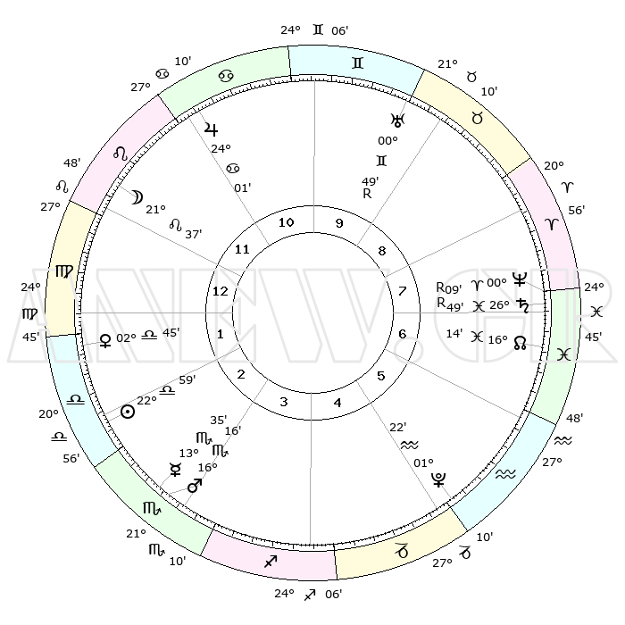 | ΘΕΣΕΙΣ ΠΛΑΝΗΤΩΝ ΑΣΤΡΟΛΟΓΙΚΟΥ ΧΑΡΤΗ ΤΗΣ ΣΤΙΓΜΗΣ ΑΥΤΗΣ | | Πλανήτης | Ζώδιο | Μοίρες | Δεκαήμ. | Σε οίκο | Απόκλιση | | Ακμές των οίκων | Ηλιος | Ζυγός | 22°51' | Τρίτο | 3 | 08 S 53 | | 1ος | 17°01' | Λέων | Σελήνη | Λέων | 19°57' | Δεύτερο | 1 | 17 N 09 | | 2ος | 09°31' | Παρθένος | Ερμής | Σκορπιός | 13°24' | Δεύτερο | 4 | 17 S 36 | | 3ος | 06°49' | Ζυγός | Αφροδίτη | Ζυγός | 02°36' | Πρώτο | 2 | 00 N 22 | | 4ος | 09°20' | Σκορπιός | Αρης | Σκορπιός | 16°11' | Δεύτερο | 4 | 16 S 54 | | 5ος | 14°28' | Τοξότης | Δίας | Καρκίνος | 24°01' | Τρίτο | 12 | 21 N 21 | | 6ος | 17°42' | Αιγόκερως | Κρόνος | Ιχθείς | 26°49'R | Τρίτο | 8 | 03 S 33 | | 7ος | 17°01' | Υδροχόος | Ουρανός | Δίδυμοι | 00°50'R | Πρώτο | 10 | 20 N 07 | | 8ος | 09°31' | Ιχθείς | Ποσειδώνας | Κριός | 00°09'R | Πρώτο | 8 | 01 S 12 | | 9ος | 06°49' | Κριός | Πλούτωνας | Υδροχόος | 01°22' | Πρώτο | 6 | 23 S 32 | | 10ος | 09°20' | Ταύρος | Β. Δεσμός | Ιχθείς | 16°15' | Δεύτερο | 8 | 05 S 25 | | 11ος | 14°28' | Δίδυμοι | Ωροσκόπος | Λέων | 17°01' | Δεύτερο | | | 12ος | 17°42' | Καρκίνος | Μεσουράνημα | Ταύρος | 09°20' | Πρώτο | | | |