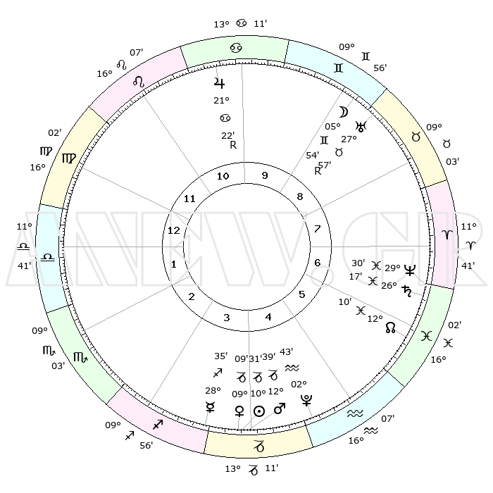 | | ΘΕΣΕΙΣ ΠΛΑΝΗΤΩΝ ΑΣΤΡΟΛΟΓΙΚΟΥ ΧΑΡΤΗ ΤΗΣ ΣΤΙΓΜΗΣ ΑΥΤΗΣ | | | | Πλανήτης | Ζώδιο | Μοίρες | Δεκαήμ. | Σε οίκο | Απόκλιση | | Ακμές των οίκων | | Ηλιος | Αιγόκερως | 10°26' | Δεύτερο | 4 | 23 S 01 | | 1ος | 20°36' | Παρθένος | | Σελήνη | Δίδυμοι | 04°50' | Πρώτο | 9 | 26 N 03 | | 2ος | 16°27' | Ζυγός | | Ερμής | Τοξότης | 28°28' | Τρίτο | 4 | 23 S 59 | | 3ος | 16°30' | Σκορπιός | | Αφροδίτη | Αιγόκερως | 09°04' | Πρώτο | 4 | 23 S 37 | | 4ος | 19°25' | Τοξότης | | Αρης | Αιγόκερως | 12°36' | Δεύτερο | 4 | 23 S 43 | | 5ος | 22°35' | Αιγόκερως | | Δίας | Καρκίνος | 21°22'R | Τρίτο | 10 | 21 N 58 | | 6ος | 23°23' | Υδροχόος | | Κρόνος | Ιχθείς | 26°17' | Τρίτο | 7 | 03 S 33 | | 7ος | 20°36' | Ιχθείς | | Ουρανός | Ταύρος | 27°57'R | Τρίτο | 9 | 19 N 30 | | 8ος | 16°27' | Κριός | | Ποσειδώνας | Ιχθείς | 29°30' | Τρίτο | 7 | 01 S 25 | | 9ος | 16°30' | Ταύρος | | Πλούτωνας | Υδροχόος | 02°43' | Πρώτο | 5 | 23 S 13 | | 10ος | 19°25' | Δίδυμοι | | Β. Δεσμός | Ιχθείς | 12°11' | Δεύτερο | 6 | 07 S 00 | | 11ος | 22°35' | Καρκίνος | | Ωροσκόπος | Παρθένος | 20°36' | Τρίτο | | | 12ος | 23°23' | Λέων | | Μεσουράνημα | Δίδυμοι | 19°25' | Δεύτερο | | | |