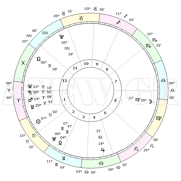 | | ΘΕΣΕΙΣ ΠΛΑΝΗΤΩΝ ΑΣΤΡΟΛΟΓΙΚΟΥ ΧΑΡΤΗ ΤΗΣ ΣΤΙΓΜΗΣ ΑΥΤΗΣ | | | | Πλανήτης | Ζώδιο | Μοίρες | Δεκαήμ. | Σε οίκο | Απόκλιση | | Ακμές των οίκων | | Ηλιος | Ταύρος | 07°46' | Πρώτο | 2 | 14 N 06 | | 1ος | 28°22' | Υδροχόος | | Σελήνη | Παρθένος | 25°36' | Τρίτο | 7 | 00 N 17 | | 2ος | 13°54' | Κριός | | Ερμής | Κριός | 20°34' | Τρίτο | 2 | 05 N 59 | | 3ος | 16°56' | Ταύρος | | Αφροδίτη | Δίδυμοι | 04°42' | Πρώτο | 3 | 21 N 50 | | 4ος | 11°30' | Δίδυμοι | | Αρης | Κριός | 14°06' | Δεύτερο | 2 | 04 N 44 | | 5ος | 03°12' | Καρκίνος | | Δίας | Καρκίνος | 18°31' | Δεύτερο | 5 | 22 N 32 | | 6ος | 26°36' | Καρκίνος | | Κρόνος | Κριός | 08°55' | Πρώτο | 1 | 01 N 33 | | 7ος | 28°22' | Λέων | | Ουρανός | Δίδυμοι | 00°07' | Πρώτο | 3 | 20 N 00 | | 8ος | 13°54' | Ζυγός | | Ποσειδώνας | Κριός | 03°10' | Πρώτο | 1 | 00 N 03 | | 9ος | 16°56' | Σκορπιός | | Πλούτωνας | Υδροχόος | 05°29' | Πρώτο | 12 | 22 S 48 | | 10ος | 11°30' | Τοξότης | | Β. Δεσμός | Ιχθείς | 05°58' | Πρώτο | 1 | 09 S 19 | | 11ος | 03°12' | Αιγόκερως | | Ωροσκόπος | Υδροχόος | 28°22' | Τρίτο | | | 12ος | 26°36' | Αιγόκερως | | Μεσουράνημα | Τοξότης | 11°30' | Δεύτερο | | | |