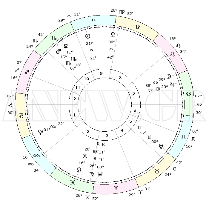 | ΘΕΣΕΙΣ ΠΛΑΝΗΤΩΝ ΑΣΤΡΟΛΟΓΙΚΟΥ ΧΑΡΤΗ ΤΗΣ ΣΤΙΓΜΗΣ ΑΥΤΗΣ | | Πλανήτης | Ζώδιο | Μοίρες | Δεκαήμ. | Σε οίκο | Απόκλιση | | Ακμές των οίκων | Ηλιος | Ζυγός | 21°13' | Τρίτο | 11 | 08 S 16 | | 1ος | 25°50' | Σκορπιός | Σελήνη | Καρκίνος | 28°10' | Τρίτο | 8 | 24 N 26 | | 2ος | 26°25' | Τοξότης | Ερμής | Σκορπιός | 11°06' | Δεύτερο | 12 | 16 S 44 | | 3ος | 01°27' | Υδροχόος | Αφροδίτη | Ζυγός | 00°32' | Πρώτο | 10 | 01 N 10 | | 4ος | 07°22' | Ιχθείς | Αρης | Σκορπιός | 15°02' | Δεύτερο | 12 | 16 S 33 | | 5ος | 08°53' | Κριός | Δίας | Καρκίνος | 23°52' | Τρίτο | 8 | 21 N 22 | | 6ος | 04°30' | Ταύρος | Κρόνος | Ιχθείς | 26°56'R | Τρίτο | 4 | 03 S 31 | | 7ος | 25°50' | Ταύρος | Ουρανός | Δίδυμοι | 00°53'R | Πρώτο | 7 | 20 N 07 | | 8ος | 26°25' | Δίδυμοι | Ποσειδώνας | Κριός | 00°12'R | Πρώτο | 4 | 01 S 11 | | 9ος | 01°27' | Λέων | Πλούτωνας | Υδροχόος | 01°22' | Πρώτο | 2 | 23 S 32 | | 10ος | 07°22' | Παρθένος | Β. Δεσμός | Ιχθείς | 16°20' | Δεύτερο | 4 | 05 S 23 | | 11ος | 08°53' | Ζυγός | Ωροσκόπος | Σκορπιός | 25°50' | Τρίτο | | | 12ος | 04°30' | Σκορπιός | Μεσουράνημα | Παρθένος | 07°22' | Πρώτο | | | |