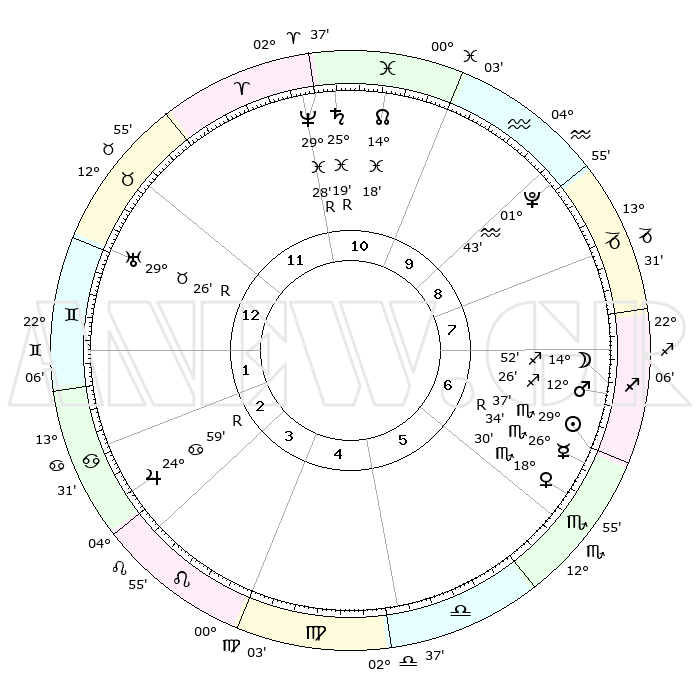 | | ΘΕΣΕΙΣ ΠΛΑΝΗΤΩΝ ΑΣΤΡΟΛΟΓΙΚΟΥ ΧΑΡΤΗ ΤΗΣ ΣΤΙΓΜΗΣ ΑΥΤΗΣ | | | | Πλανήτης | Ζώδιο | Μοίρες | Δεκαήμ. | Σε οίκο | Απόκλιση | | Ακμές των οίκων | | Ηλιος | Σκορπιός | 29°34' | Τρίτο | 6 | 20 S 03 | | 1ος | 05°56' | Δίδυμοι | | Σελήνη | Τοξότης | 14°22' | Δεύτερο | 7 | 27 S 29 | | 2ος | 29°37' | Δίδυμοι | | Ερμής | Σκορπιός | 26°37'R | Τρίτο | 6 | 18 S 28 | | 3ος | 20°53' | Καρκίνος | | Αφροδίτη | Σκορπιός | 18°27' | Δεύτερο | 6 | 16 S 20 | | 4ος | 14°08' | Λέων | | Αρης | Τοξότης | 12°24' | Δεύτερο | 7 | 22 S 51 | | 5ος | 13°39' | Παρθένος | | Δίας | Καρκίνος | 24°59'R | Τρίτο | 3 | 21 N 16 | | 6ος | 22°56' | Ζυγός | | Κρόνος | Ιχθείς | 25°19'R | Τρίτο | 11 | 04 S 04 | | 7ος | 05°56' | Τοξότης | | Ουρανός | Ταύρος | 29°26'R | Τρίτο | 12 | 19 N 49 | | 8ος | 29°37' | Τοξότης | | Ποσειδώνας | Ιχθείς | 29°28'R | Τρίτο | 11 | 01 S 27 | | 9ος | 20°53' | Αιγόκερως | | Πλούτωνας | Υδροχόος | 01°43' | Πρώτο | 9 | 23 S 27 | | 10ος | 14°08' | Υδροχόος | | Β. Δεσμός | Ιχθείς | 14°18' | Δεύτερο | 11 | 06 S 11 | | 11ος | 13°39' | Ιχθείς | | Ωροσκόπος | Δίδυμοι | 05°56' | Πρώτο | | | 12ος | 22°56' | Κριός | | Μεσουράνημα | Υδροχόος | 14°08' | Δεύτερο | | | |