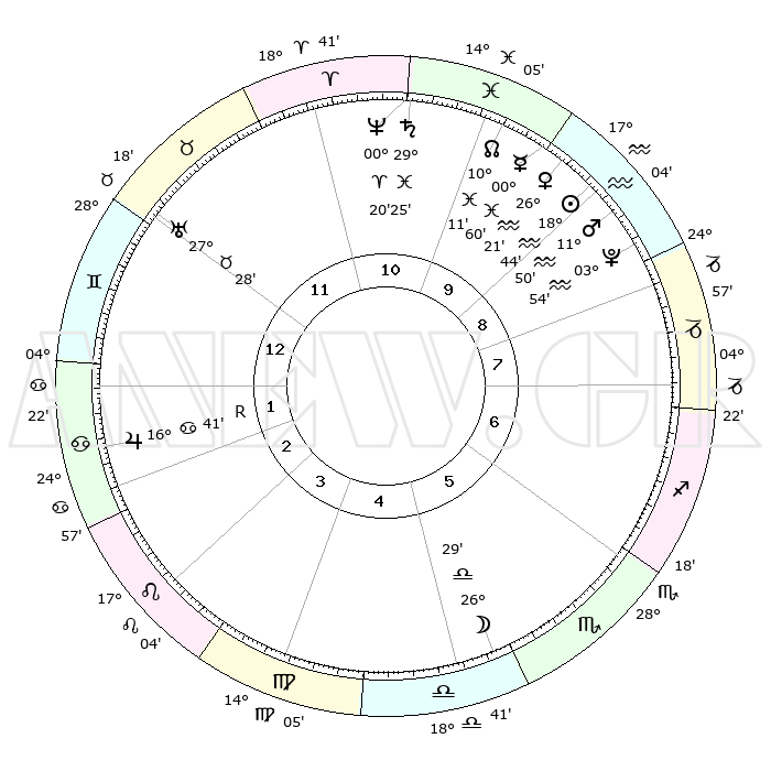 | | ΘΕΣΕΙΣ ΠΛΑΝΗΤΩΝ ΑΣΤΡΟΛΟΓΙΚΟΥ ΧΑΡΤΗ ΤΗΣ ΣΤΙΓΜΗΣ ΑΥΤΗΣ | | | | Πλανήτης | Ζώδιο | Μοίρες | Δεκαήμ. | Σε οίκο | Απόκλιση | | Ακμές των οίκων | | Ηλιος | Υδροχόος | 18°39' | Δεύτερο | 10 | 15 S 14 | | 1ος | 08°21' | Δίδυμοι | | Σελήνη | Ζυγός | 25°35' | Τρίτο | 5 | 13 S 26 | | 2ος | 01°37' | Καρκίνος | | Ερμής | Ιχθείς | 00°52' | Πρώτο | 10 | 12 S 21 | | 3ος | 22°50' | Καρκίνος | | Αφροδίτη | Υδροχόος | 26°16' | Τρίτο | 10 | 14 S 07 | | 4ος | 16°19' | Λέων | | Αρης | Υδροχόος | 11°47' | Δεύτερο | 9 | 18 S 16 | | 5ος | 16°17' | Παρθένος | | Δίας | Καρκίνος | 16°41'R | Δεύτερο | 2 | 22 N 42 | | 6ος | 25°51' | Ζυγός | | Κρόνος | Ιχθείς | 29°25' | Τρίτο | 11 | 02 S 13 | | 7ος | 08°21' | Τοξότης | | Ουρανός | Ταύρος | 27°28' | Τρίτο | 12 | 19 N 24 | | 8ος | 01°37' | Αιγόκερως | | Ποσειδώνας | Κριός | 00°20' | Πρώτο | 11 | 01 S 04 | | 9ος | 22°50' | Αιγόκερως | | Πλούτωνας | Υδροχόος | 03°54' | Πρώτο | 9 | 22 S 59 | | 10ος | 16°19' | Υδροχόος | | Β. Δεσμός | Ιχθείς | 10°11' | Δεύτερο | 10 | 07 S 45 | | 11ος | 16°17' | Ιχθείς | | Ωροσκόπος | Δίδυμοι | 08°21' | Πρώτο | | | 12ος | 25°51' | Κριός | | Μεσουράνημα | Υδροχόος | 16°19' | Δεύτερο | | | |