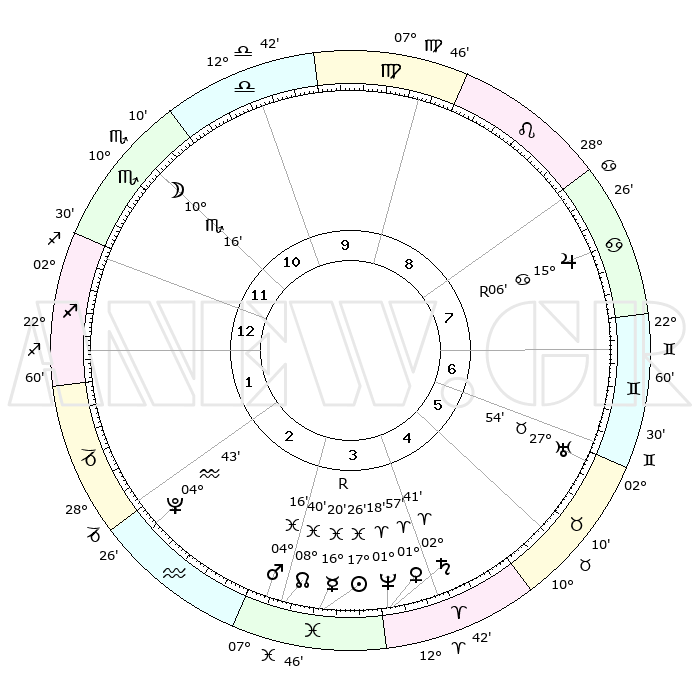 | | ΘΕΣΕΙΣ ΠΛΑΝΗΤΩΝ ΑΣΤΡΟΛΟΓΙΚΟΥ ΧΑΡΤΗ ΤΗΣ ΣΤΙΓΜΗΣ ΑΥΤΗΣ | | | | Πλανήτης | Ζώδιο | Μοίρες | Δεκαήμ. | Σε οίκο | Απόκλιση | | Ακμές των οίκων | | Ηλιος | Ιχθείς | 17°22' | Δεύτερο | 4 | 04 S 59 | | 1ος | 01°32' | Τοξότης | | Σελήνη | Σκορπιός | 09°24' | Πρώτο | 11 | 18 S 58 | | 2ος | 02°53' | Αιγόκερως | | Ερμής | Ιχθείς | 16°24'R | Δεύτερο | 4 | 02 S 02 | | 3ος | 08°51' | Υδροχόος | | Αφροδίτη | Κριός | 01°52' | Πρώτο | 4 | 00 S 23 | | 4ος | 14°55' | Ιχθείς | | Αρης | Ιχθείς | 04°13' | Πρώτο | 3 | 10 S 59 | | 5ος | 15°45' | Κριός | | Δίας | Καρκίνος | 15°06'R | Δεύτερο | 8 | 22 N 56 | | 6ος | 10°36' | Ταύρος | | Κρόνος | Κριός | 02°41' | Πρώτο | 4 | 00 S 53 | | 7ος | 01°32' | Δίδυμοι | | Ουρανός | Ταύρος | 27°54' | Τρίτο | 6 | 19 N 31 | | 8ος | 02°53' | Καρκίνος | | Ποσειδώνας | Κριός | 01°18' | Πρώτο | 4 | 00 S 41 | | 9ος | 08°51' | Λέων | | Πλούτωνας | Υδροχόος | 04°43' | Πρώτο | 2 | 22 S 51 | | 10ος | 14°55' | Παρθένος | | Β. Δεσμός | Ιχθείς | 08°41' | Πρώτο | 3 | 08 S 19 | | 11ος | 15°45' | Ζυγός | | Ωροσκόπος | Τοξότης | 01°32' | Πρώτο | | | 12ος | 10°36' | Σκορπιός | | Μεσουράνημα | Παρθένος | 14°55' | Δεύτερο | | | |