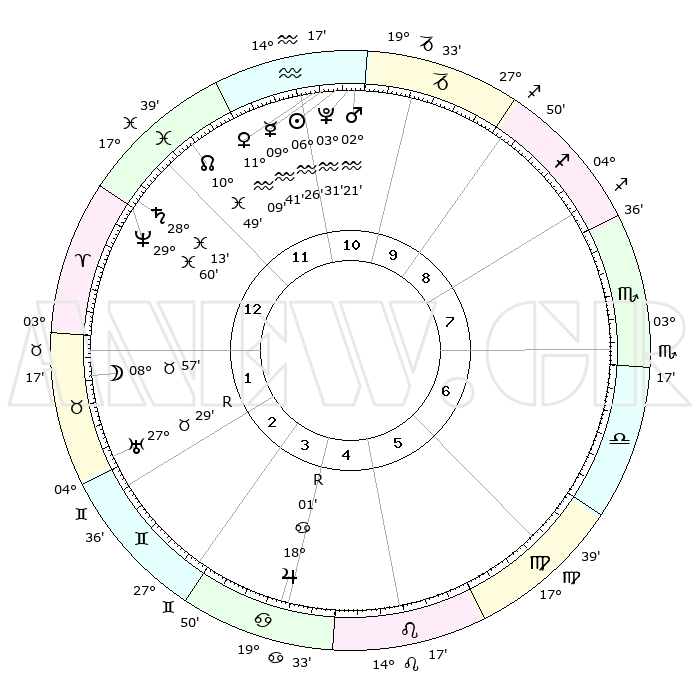 | | ΘΕΣΕΙΣ ΠΛΑΝΗΤΩΝ ΑΣΤΡΟΛΟΓΙΚΟΥ ΧΑΡΤΗ ΤΗΣ ΣΤΙΓΜΗΣ ΑΥΤΗΣ | | | | Πλανήτης | Ζώδιο | Μοίρες | Δεκαήμ. | Σε οίκο | Απόκλιση | | Ακμές των οίκων | | Ηλιος | Υδροχόος | 06°22' | Πρώτο | 11 | 18 S 41 | | 1ος | 24°25' | Ιχθείς | | Σελήνη | Ταύρος | 07°60' | Πρώτο | 2 | 18 N 22 | | 2ος | 06°00' | Ταύρος | | Ερμής | Υδροχόος | 09°34' | Πρώτο | 11 | 19 S 51 | | 3ος | 04°17' | Δίδυμοι | | Αφροδίτη | Υδροχόος | 11°04' | Δεύτερο | 11 | 18 S 40 | | 4ος | 26°52' | Δίδυμοι | | Αρης | Υδροχόος | 02°18' | Πρώτο | 11 | 20 S 38 | | 5ος | 18°57' | Καρκίνος | | Δίας | Καρκίνος | 18°01'R | Δεύτερο | 4 | 22 N 31 | | 6ος | 15°31' | Λέων | | Κρόνος | Ιχθείς | 28°13' | Τρίτο | 1 | 02 S 43 | | 7ος | 24°25' | Παρθένος | | Ουρανός | Ταύρος | 27°29'R | Τρίτο | 2 | 19 N 25 | | 8ος | 06°00' | Σκορπιός | | Ποσειδώνας | Ιχθείς | 29°60' | Τρίτο | 1 | 01 S 13 | | 9ος | 04°17' | Τοξότης | | Πλούτωνας | Υδροχόος | 03°31' | Πρώτο | 11 | 23 S 03 | | 10ος | 26°52' | Τοξότης | | Β. Δεσμός | Ιχθείς | 10°50' | Δεύτερο | 12 | 07 S 30 | | 11ος | 18°57' | Αιγόκερως | | Ωροσκόπος | Ιχθείς | 24°25' | Τρίτο | | | 12ος | 15°31' | Υδροχόος | | Μεσουράνημα | Τοξότης | 26°52' | Τρίτο | | | |