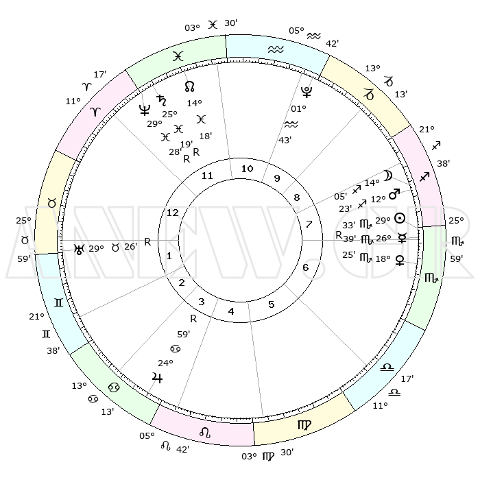 | | ΘΕΣΕΙΣ ΠΛΑΝΗΤΩΝ ΑΣΤΡΟΛΟΓΙΚΟΥ ΧΑΡΤΗ ΤΗΣ ΣΤΙΓΜΗΣ ΑΥΤΗΣ | | | | Πλανήτης | Ζώδιο | Μοίρες | Δεκαήμ. | Σε οίκο | Απόκλιση | | Ακμές των οίκων | | Ηλιος | Σκορπιός | 29°30' | Τρίτο | 7 | 20 S 02 | | 1ος | 06°01' | Ταύρος | | Σελήνη | Τοξότης | 13°35' | Δεύτερο | 8 | 27 S 23 | | 2ος | 06°35' | Δίδυμοι | | Ερμής | Σκορπιός | 26°42'R | Τρίτο | 7 | 18 S 30 | | 3ος | 29°34' | Δίδυμοι | | Αφροδίτη | Σκορπιός | 18°22' | Δεύτερο | 7 | 16 S 19 | | 4ος | 21°18' | Καρκίνος | | Αρης | Τοξότης | 12°21' | Δεύτερο | 8 | 22 S 51 | | 5ος | 16°21' | Λέων | | Δίας | Καρκίνος | 24°59'R | Τρίτο | 4 | 21 N 16 | | 6ος | 20°15' | Παρθένος | | Κρόνος | Ιχθείς | 25°19'R | Τρίτο | 12 | 04 S 04 | | 7ος | 06°01' | Σκορπιός | | Ουρανός | Ταύρος | 29°26'R | Τρίτο | 1 | 19 N 49 | | 8ος | 06°35' | Τοξότης | | Ποσειδώνας | Ιχθείς | 29°28'R | Τρίτο | 12 | 01 S 27 | | 9ος | 29°34' | Τοξότης | | Πλούτωνας | Υδροχόος | 01°43' | Πρώτο | 10 | 23 S 27 | | 10ος | 21°18' | Αιγόκερως | | Β. Δεσμός | Ιχθείς | 14°19' | Δεύτερο | 11 | 06 S 10 | | 11ος | 16°21' | Υδροχόος | | Ωροσκόπος | Ταύρος | 06°01' | Πρώτο | | | 12ος | 20°15' | Ιχθείς | | Μεσουράνημα | Αιγόκερως | 21°18' | Τρίτο | | | |