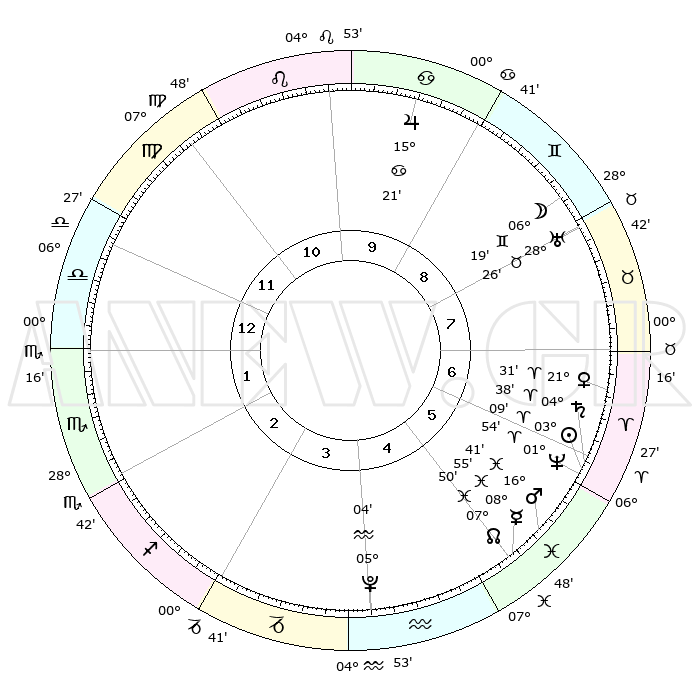 | | ΘΕΣΕΙΣ ΠΛΑΝΗΤΩΝ ΑΣΤΡΟΛΟΓΙΚΟΥ ΧΑΡΤΗ ΤΗΣ ΣΤΙΓΜΗΣ ΑΥΤΗΣ | | | | Πλανήτης | Ζώδιο | Μοίρες | Δεκαήμ. | Σε οίκο | Απόκλιση | | Ακμές των οίκων | | Ηλιος | Κριός | 03°05' | Πρώτο | 6 | 01 N 13 | | 1ος | 08°06' | Ζυγός | | Σελήνη | Δίδυμοι | 05°13' | Πρώτο | 8 | 26 N 18 | | 2ος | 05°14' | Σκορπιός | | Ερμής | Ιχθείς | 08°54' | Πρώτο | 5 | 07 S 57 | | 3ος | 05°58' | Τοξότης | | Αφροδίτη | Κριός | 21°25' | Τρίτο | 7 | 07 N 39 | | 4ος | 09°06' | Αιγόκερως | | Αρης | Ιχθείς | 16°38' | Δεύτερο | 6 | 06 S 16 | | 5ος | 12°02' | Υδροχόος | | Δίας | Καρκίνος | 15°20' | Δεύτερο | 10 | 22 N 55 | | 6ος | 12°08' | Ιχθείς | | Κρόνος | Κριός | 04°38' | Πρώτο | 6 | 00 S 07 | | 7ος | 08°06' | Κριός | | Ουρανός | Ταύρος | 28°25' | Τρίτο | 8 | 19 N 38 | | 8ος | 05°14' | Ταύρος | | Ποσειδώνας | Κριός | 01°54' | Πρώτο | 6 | 00 S 27 | | 9ος | 05°58' | Δίδυμοι | | Πλούτωνας | Υδροχόος | 05°04' | Πρώτο | 4 | 22 S 48 | | 10ος | 09°06' | Καρκίνος | | Β. Δεσμός | Ιχθείς | 07°51' | Πρώτο | 5 | 08 S 38 | | 11ος | 12°02' | Λέων | | Ωροσκόπος | Ζυγός | 08°06' | Πρώτο | | | 12ος | 12°08' | Παρθένος | | Μεσουράνημα | Καρκίνος | 09°06' | Πρώτο | | | |