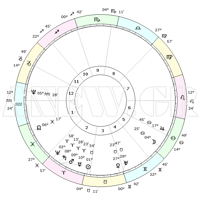 | | ΘΕΣΕΙΣ ΠΛΑΝΗΤΩΝ ΑΣΤΡΟΛΟΓΙΚΟΥ ΧΑΡΤΗ ΤΗΣ ΣΤΙΓΜΗΣ ΑΥΤΗΣ | | | | Πλανήτης | Ζώδιο | Μοίρες | Δεκαήμ. | Σε οίκο | Απόκλιση | | Ακμές των οίκων | | Ηλιος | Ταύρος | 01°50' | Πρώτο | 3 | 12 N 06 | | 1ος | 12°43' | Αιγόκερως | | Σελήνη | Καρκίνος | 03°23' | Πρώτο | 6 | 27 N 59 | | 2ος | 23°07' | Υδροχόος | | Ερμής | Κριός | 10°16' | Δεύτερο | 3 | 01 N 42 | | 3ος | 03°20' | Κριός | | Αφροδίτη | Ταύρος | 27°18' | Τρίτο | 4 | 20 N 02 | | 4ος | 05°00' | Ταύρος | | Αρης | Κριός | 09°25' | Πρώτο | 3 | 02 N 52 | | 5ος | 29°29' | Ταύρος | | Δίας | Καρκίνος | 17°44' | Δεύτερο | 7 | 22 N 38 | | 6ος | 20°45' | Δίδυμοι | | Κρόνος | Κριός | 08°13' | Πρώτο | 3 | 01 N 17 | | 7ος | 12°43' | Καρκίνος | | Ουρανός | Ταύρος | 29°47' | Τρίτο | 5 | 19 N 56 | | 8ος | 23°07' | Λέων | | Ποσειδώνας | Κριός | 02°58' | Πρώτο | 2 | 00 S 02 | | 9ος | 03°20' | Ζυγός | | Πλούτωνας | Υδροχόος | 05°28' | Πρώτο | 1 | 22 S 48 | | 10ος | 05°00' | Σκορπιός | | Β. Δεσμός | Ιχθείς | 06°18' | Πρώτο | 2 | 09 S 12 | | 11ος | 29°29' | Σκορπιός | | Ωροσκόπος | Αιγόκερως | 12°43' | Δεύτερο | | | 12ος | 20°45' | Τοξότης | | Μεσουράνημα | Σκορπιός | 05°00' | Πρώτο | | | |