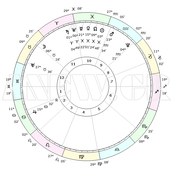 | | ΘΕΣΕΙΣ ΠΛΑΝΗΤΩΝ ΑΣΤΡΟΛΟΓΙΚΟΥ ΧΑΡΤΗ ΤΗΣ ΣΤΙΓΜΗΣ ΑΥΤΗΣ | | | | Πλανήτης | Ζώδιο | Μοίρες | Δεκαήμ. | Σε οίκο | Απόκλιση | | Ακμές των οίκων | | Ηλιος | Ιχθείς | 03°44' | Πρώτο | 11 | 10 S 08 | | 1ος | 20°13' | Ταύρος | | Σελήνη | Ταύρος | 05°15' | Πρώτο | 12 | 17 N 25 | | 2ος | 17°11' | Δίδυμοι | | Ερμής | Ιχθείς | 21°19' | Τρίτο | 11 | 01 S 45 | | 3ος | 09°04' | Καρκίνος | | Αφροδίτη | Ιχθείς | 14°56' | Δεύτερο | 11 | 07 S 15 | | 4ος | 01°15' | Λέων | | Αρης | Υδροχόος | 23°31' | Τρίτο | 10 | 14 S 42 | | 5ος | 28°08' | Λέων | | Δίας | Καρκίνος | 15°33'R | Δεύτερο | 3 | 22 N 52 | | 6ος | 04°52' | Ζυγός | | Κρόνος | Κριός | 01°03' | Πρώτο | 11 | 01 S 33 | | 7ος | 20°13' | Σκορπιός | | Ουρανός | Ταύρος | 27°36' | Τρίτο | 1 | 19 N 27 | | 8ος | 17°11' | Τοξότης | | Ποσειδώνας | Κριός | 00°49' | Πρώτο | 11 | 00 S 53 | | 9ος | 09°04' | Αιγόκερως | | Πλούτωνας | Υδροχόος | 04°21' | Πρώτο | 10 | 22 S 54 | | 10ος | 01°15' | Υδροχόος | | Β. Δεσμός | Ιχθείς | 09°24' | Πρώτο | 11 | 08 S 03 | | 11ος | 28°08' | Υδροχόος | | Ωροσκόπος | Ταύρος | 20°13' | Τρίτο | | | 12ος | 04°52' | Κριός | | Μεσουράνημα | Υδροχόος | 01°15' | Πρώτο | | | |