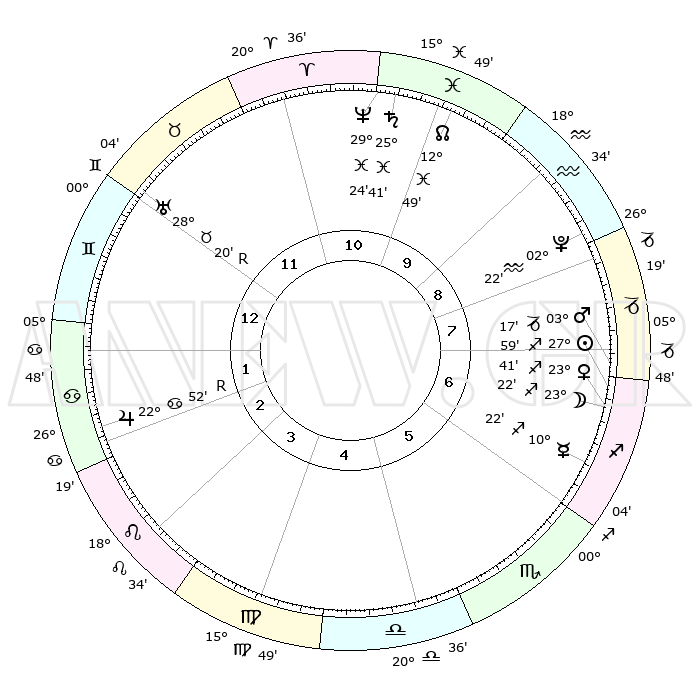 | | ΘΕΣΕΙΣ ΠΛΑΝΗΤΩΝ ΑΣΤΡΟΛΟΓΙΚΟΥ ΧΑΡΤΗ ΤΗΣ ΣΤΙΓΜΗΣ ΑΥΤΗΣ | | | | Πλανήτης | Ζώδιο | Μοίρες | Δεκαήμ. | Σε οίκο | Απόκλιση | | Ακμές των οίκων | | Ηλιος | Τοξότης | 27°55' | Τρίτο | 7 | 23 S 25 | | 1ος | 12°13' | Δίδυμοι | | Σελήνη | Τοξότης | 22°33' | Τρίτο | 7 | 28 S 08 | | 2ος | 04°53' | Καρκίνος | | Ερμής | Τοξότης | 10°16' | Δεύτερο | 6 | 21 S 03 | | 3ος | 26°05' | Καρκίνος | | Αφροδίτη | Τοξότης | 23°36' | Τρίτο | 7 | 23 S 18 | | 4ος | 19°59' | Λέων | | Αρης | Αιγόκερως | 03°14' | Πρώτο | 7 | 24 S 12 | | 5ος | 20°41' | Παρθένος | | Δίας | Καρκίνος | 22°52'R | Τρίτο | 2 | 21 N 42 | | 6ος | 00°36' | Σκορπιός | | Κρόνος | Ιχθείς | 25°41' | Τρίτο | 11 | 03 S 50 | | 7ος | 12°13' | Τοξότης | | Ουρανός | Ταύρος | 28°20'R | Τρίτο | 12 | 19 N 35 | | 8ος | 04°53' | Αιγόκερως | | Ποσειδώνας | Ιχθείς | 29°24' | Τρίτο | 11 | 01 S 28 | | 9ος | 26°05' | Αιγόκερως | | Πλούτωνας | Υδροχόος | 02°22' | Πρώτο | 9 | 23 S 18 | | 10ος | 19°59' | Υδροχόος | | Β. Δεσμός | Ιχθείς | 12°50' | Δεύτερο | 10 | 06 S 45 | | 11ος | 20°41' | Ιχθείς | | Ωροσκόπος | Δίδυμοι | 12°13' | Δεύτερο | | | 12ος | 00°36' | Ταύρος | | Μεσουράνημα | Υδροχόος | 19°59' | Δεύτερο | | | |