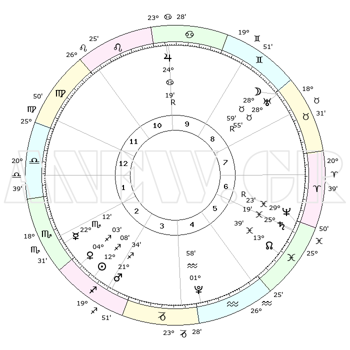 | | ΘΕΣΕΙΣ ΠΛΑΝΗΤΩΝ ΑΣΤΡΟΛΟΓΙΚΟΥ ΧΑΡΤΗ ΤΗΣ ΣΤΙΓΜΗΣ ΑΥΤΗΣ | | | | Πλανήτης | Ζώδιο | Μοίρες | Δεκαήμ. | Σε οίκο | Απόκλιση | | Ακμές των οίκων | | Ηλιος | Τοξότης | 12°06' | Δεύτερο | 3 | 22 S 14 | | 1ος | 10°39' | Ζυγός | | Σελήνη | Ταύρος | 28°28' | Τρίτο | 8 | 24 N 31 | | 2ος | 07°57' | Σκορπιός | | Ερμής | Σκορπιός | 22°11' | Τρίτο | 2 | 15 S 49 | | 3ος | 08°48' | Τοξότης | | Αφροδίτη | Τοξότης | 04°00' | Πρώτο | 2 | 20 S 22 | | 4ος | 11°60' | Αιγόκερως | | Αρης | Τοξότης | 21°33' | Τρίτο | 3 | 23 S 51 | | 5ος | 14°56' | Υδροχόος | | Δίας | Καρκίνος | 24°20'R | Τρίτο | 10 | 21 N 25 | | 6ος | 14°55' | Ιχθείς | | Κρόνος | Ιχθείς | 25°19' | Τρίτο | 6 | 04 S 02 | | 7ος | 10°39' | Κριός | | Ουρανός | Ταύρος | 28°55'R | Τρίτο | 8 | 19 N 43 | | 8ος | 07°57' | Ταύρος | | Ποσειδώνας | Ιχθείς | 29°23'R | Τρίτο | 6 | 01 S 29 | | 9ος | 08°48' | Δίδυμοι | | Πλούτωνας | Υδροχόος | 01°58' | Πρώτο | 4 | 23 S 23 | | 10ος | 11°60' | Καρκίνος | | Β. Δεσμός | Ιχθείς | 13°39' | Δεύτερο | 5 | 06 S 26 | | 11ος | 14°56' | Λέων | | Ωροσκόπος | Ζυγός | 10°39' | Δεύτερο | | | 12ος | 14°55' | Παρθένος | | Μεσουράνημα | Καρκίνος | 11°60' | Δεύτερο | | | |