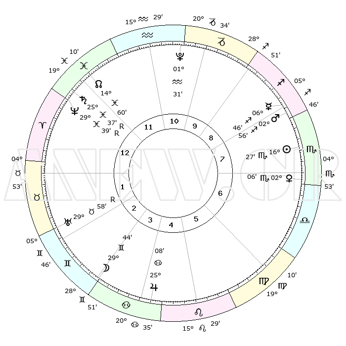 | | ΘΕΣΕΙΣ ΠΛΑΝΗΤΩΝ ΑΣΤΡΟΛΟΓΙΚΟΥ ΧΑΡΤΗ ΤΗΣ ΣΤΙΓΜΗΣ ΑΥΤΗΣ | | | | Πλανήτης | Ζώδιο | Μοίρες | Δεκαήμ. | Σε οίκο | Απόκλιση | | Ακμές των οίκων | | Ηλιος | Σκορπιός | 16°22' | Δεύτερο | 8 | 16 S 44 | | 1ος | 18°53' | Ιχθείς | | Σελήνη | Δίδυμοι | 28°32' | Τρίτο | 4 | 28 N 23 | | 2ος | 01°38' | Ταύρος | | Ερμής | Τοξότης | 06°45' | Πρώτο | 9 | 23 S 55 | | 3ος | 00°50' | Δίδυμοι | | Αφροδίτη | Σκορπιός | 02°00' | Πρώτο | 8 | 10 S 54 | | 4ος | 23°44' | Δίδυμοι | | Αρης | Τοξότης | 02°53' | Πρώτο | 9 | 21 S 11 | | 5ος | 15°38' | Καρκίνος | | Δίας | Καρκίνος | 25°08' | Τρίτο | 5 | 21 N 12 | | 6ος | 11°26' | Λέων | | Κρόνος | Ιχθείς | 25°37'R | Τρίτο | 1 | 03 S 59 | | 7ος | 18°53' | Παρθένος | | Ουρανός | Ταύρος | 29°59'R | Τρίτο | 2 | 19 N 56 | | 8ος | 01°38' | Σκορπιός | | Ποσειδώνας | Ιχθείς | 29°39'R | Τρίτο | 1 | 01 S 24 | | 9ος | 00°50' | Τοξότης | | Πλούτωνας | Υδροχόος | 01°31' | Πρώτο | 11 | 23 S 30 | | 10ος | 23°44' | Τοξότης | | Β. Δεσμός | Ιχθείς | 15°00' | Δεύτερο | 12 | 05 S 54 | | 11ος | 15°38' | Αιγόκερως | | Ωροσκόπος | Ιχθείς | 18°53' | Δεύτερο | | | 12ος | 11°26' | Υδροχόος | | Μεσουράνημα | Τοξότης | 23°44' | Τρίτο | | | |