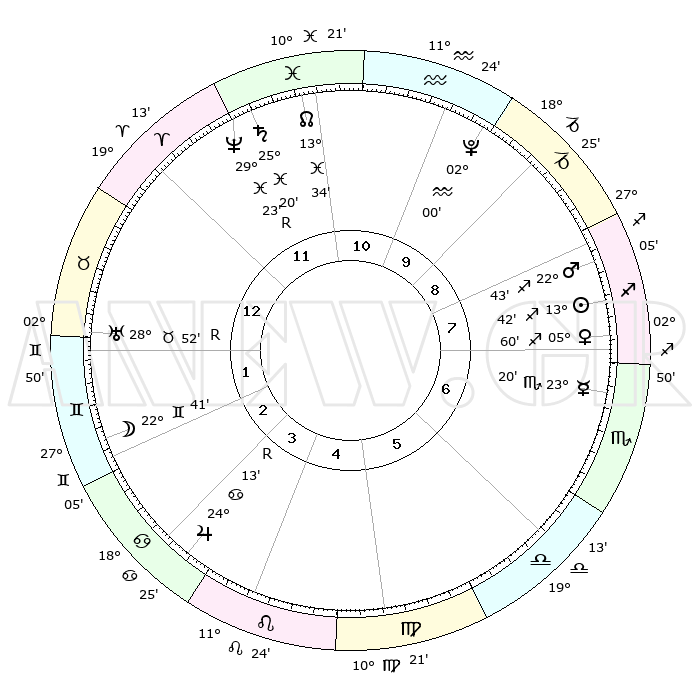 | | ΘΕΣΕΙΣ ΠΛΑΝΗΤΩΝ ΑΣΤΡΟΛΟΓΙΚΟΥ ΧΑΡΤΗ ΤΗΣ ΣΤΙΓΜΗΣ ΑΥΤΗΣ | | | | Πλανήτης | Ζώδιο | Μοίρες | Δεκαήμ. | Σε οίκο | Απόκλιση | | Ακμές των οίκων | | Ηλιος | Τοξότης | 13°40' | Δεύτερο | 7 | 22 S 26 | | 1ος | 16°05' | Ταύρος | | Σελήνη | Δίδυμοι | 22°06' | Τρίτο | 2 | 28 N 08 | | 2ος | 14°03' | Δίδυμοι | | Ερμής | Σκορπιός | 23°18' | Τρίτο | 7 | 16 S 10 | | 3ος | 06°12' | Καρκίνος | | Αφροδίτη | Τοξότης | 05°57' | Πρώτο | 7 | 20 S 46 | | 4ος | 28°13' | Καρκίνος | | Αρης | Τοξότης | 22°42' | Τρίτο | 8 | 23 S 56 | | 5ος | 24°30' | Λέων | | Δίας | Καρκίνος | 24°13'R | Τρίτο | 3 | 21 N 26 | | 6ος | 00°26' | Ζυγός | | Κρόνος | Ιχθείς | 25°20' | Τρίτο | 11 | 04 S 01 | | 7ος | 16°05' | Σκορπιός | | Ουρανός | Ταύρος | 28°52'R | Τρίτο | 1 | 19 N 42 | | 8ος | 14°03' | Τοξότης | | Ποσειδώνας | Ιχθείς | 29°23'R | Τρίτο | 11 | 01 S 29 | | 9ος | 06°12' | Αιγόκερως | | Πλούτωνας | Υδροχόος | 02°00' | Πρώτο | 10 | 23 S 23 | | 10ος | 28°13' | Αιγόκερως | | Β. Δεσμός | Ιχθείς | 13°34' | Δεύτερο | 11 | 06 S 27 | | 11ος | 24°30' | Υδροχόος | | Ωροσκόπος | Ταύρος | 16°05' | Δεύτερο | | | 12ος | 00°26' | Κριός | | Μεσουράνημα | Αιγόκερως | 28°13' | Τρίτο | | | |