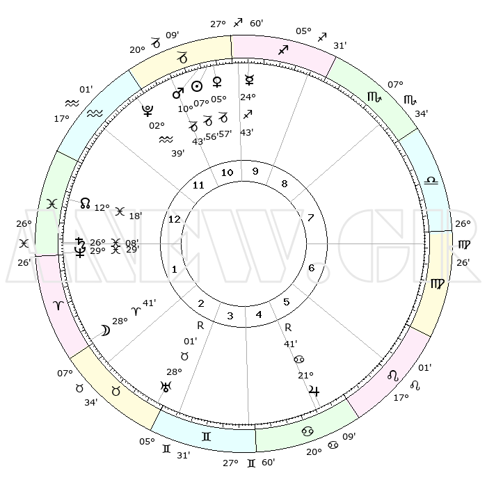 | | ΘΕΣΕΙΣ ΠΛΑΝΗΤΩΝ ΑΣΤΡΟΛΟΓΙΚΟΥ ΧΑΡΤΗ ΤΗΣ ΣΤΙΓΜΗΣ ΑΥΤΗΣ | | | | Πλανήτης | Ζώδιο | Μοίρες | Δεκαήμ. | Σε οίκο | Απόκλιση | | Ακμές των οίκων | | Ηλιος | Αιγόκερως | 07°51' | Πρώτο | 11 | 23 S 12 | | 1ος | 17°22' | Υδροχόος | | Σελήνη | Κριός | 27°40' | Τρίτο | 2 | 14 N 05 | | 2ος | 03°09' | Κριός | | Ερμής | Τοξότης | 24°37' | Τρίτο | 10 | 23 S 35 | | 3ος | 08°23' | Ταύρος | | Αφροδίτη | Αιγόκερως | 05°52' | Πρώτο | 11 | 23 S 42 | | 4ος | 04°14' | Δίδυμοι | | Αρης | Αιγόκερως | 10°39' | Δεύτερο | 11 | 23 S 53 | | 5ος | 26°07' | Δίδυμοι | | Δίας | Καρκίνος | 21°42'R | Τρίτο | 6 | 21 N 55 | | 6ος | 18°32' | Καρκίνος | | Κρόνος | Ιχθείς | 26°08' | Τρίτο | 1 | 03 S 37 | | 7ος | 17°22' | Λέων | | Ουρανός | Ταύρος | 28°01'R | Τρίτο | 3 | 19 N 31 | | 8ος | 03°09' | Ζυγός | | Ποσειδώνας | Ιχθείς | 29°29' | Τρίτο | 1 | 01 S 26 | | 9ος | 08°23' | Σκορπιός | | Πλούτωνας | Υδροχόος | 02°39' | Πρώτο | 12 | 23 S 14 | | 10ος | 04°14' | Τοξότης | | Β. Δεσμός | Ιχθείς | 12°19' | Δεύτερο | 1 | 06 S 56 | | 11ος | 26°07' | Τοξότης | | Ωροσκόπος | Υδροχόος | 17°22' | Δεύτερο | | | 12ος | 18°32' | Αιγόκερως | | Μεσουράνημα | Τοξότης | 04°14' | Πρώτο | | | |