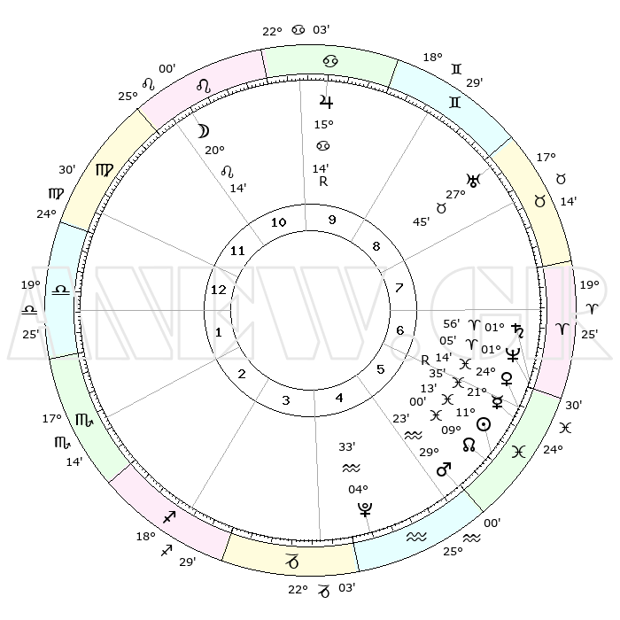 | | ΘΕΣΕΙΣ ΠΛΑΝΗΤΩΝ ΑΣΤΡΟΛΟΓΙΚΟΥ ΧΑΡΤΗ ΤΗΣ ΣΤΙΓΜΗΣ ΑΥΤΗΣ | | | | Πλανήτης | Ζώδιο | Μοίρες | Δεκαήμ. | Σε οίκο | Απόκλιση | | Ακμές των οίκων | | Ηλιος | Ιχθείς | 11°10' | Δεύτερο | 6 | 07 S 23 | | 1ος | 03°05' | Ζυγός | | Σελήνη | Λέων | 19°29' | Δεύτερο | 11 | 16 N 39 | | 2ος | 29°53' | Ζυγός | | Ερμής | Ιχθείς | 21°37'R | Τρίτο | 6 | 00 S 12 | | 3ος | 00°26' | Τοξότης | | Αφροδίτη | Ιχθείς | 24°10' | Τρίτο | 6 | 03 S 33 | | 4ος | 03°27' | Αιγόκερως | | Αρης | Υδροχόος | 29°21' | Τρίτο | 5 | 12 S 43 | | 5ος | 06°24' | Υδροχόος | | Δίας | Καρκίνος | 15°14'R | Δεύτερο | 10 | 22 N 54 | | 6ος | 06°43' | Ιχθείς | | Κρόνος | Κριός | 01°56' | Πρώτο | 6 | 01 S 11 | | 7ος | 03°05' | Κριός | | Ουρανός | Ταύρος | 27°45' | Τρίτο | 8 | 19 N 29 | | 8ος | 29°53' | Κριός | | Ποσειδώνας | Κριός | 01°05' | Πρώτο | 6 | 00 S 46 | | 9ος | 00°26' | Δίδυμοι | | Πλούτωνας | Υδροχόος | 04°33' | Πρώτο | 4 | 22 S 52 | | 10ος | 03°27' | Καρκίνος | | Β. Δεσμός | Ιχθείς | 09°00' | Πρώτο | 6 | 08 S 11 | | 11ος | 06°24' | Λέων | | Ωροσκόπος | Ζυγός | 03°05' | Πρώτο | | | 12ος | 06°43' | Παρθένος | | Μεσουράνημα | Καρκίνος | 03°27' | Πρώτο | | | |