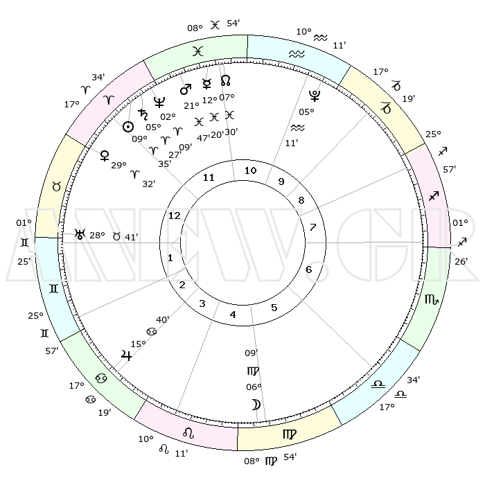 | | ΘΕΣΕΙΣ ΠΛΑΝΗΤΩΝ ΑΣΤΡΟΛΟΓΙΚΟΥ ΧΑΡΤΗ ΤΗΣ ΣΤΙΓΜΗΣ ΑΥΤΗΣ | | | | Πλανήτης | Ζώδιο | Μοίρες | Δεκαήμ. | Σε οίκο | Απόκλιση | | Ακμές των οίκων | | Ηλιος | Κριός | 09°30' | Πρώτο | 12 | 03 N 46 | | 1ος | 21°25' | Κριός | | Σελήνη | Παρθένος | 05°05' | Πρώτο | 5 | 09 N 57 | | 2ος | 26°01' | Ταύρος | | Ερμής | Ιχθείς | 12°16' | Δεύτερο | 12 | 07 S 53 | | 3ος | 20°32' | Δίδυμοι | | Αφροδίτη | Κριός | 29°26' | Τρίτο | 1 | 10 N 47 | | 4ος | 12°15' | Καρκίνος | | Αρης | Ιχθείς | 21°43' | Τρίτο | 12 | 04 S 15 | | 5ος | 05°52' | Λέων | | Δίας | Καρκίνος | 15°40' | Δεύτερο | 4 | 22 N 53 | | 6ος | 06°56' | Παρθένος | | Κρόνος | Κριός | 05°26' | Πρώτο | 12 | 00 N 12 | | 7ος | 21°25' | Ζυγός | | Ουρανός | Ταύρος | 28°41' | Τρίτο | 2 | 19 N 42 | | 8ος | 26°01' | Σκορπιός | | Ποσειδώνας | Κριός | 02°09' | Πρώτο | 12 | 00 S 21 | | 9ος | 20°32' | Τοξότης | | Πλούτωνας | Υδροχόος | 05°11' | Πρώτο | 10 | 22 S 48 | | 10ος | 12°15' | Αιγόκερως | | Β. Δεσμός | Ιχθείς | 07°30' | Πρώτο | 12 | 08 S 45 | | 11ος | 05°52' | Υδροχόος | | Ωροσκόπος | Κριός | 21°25' | Τρίτο | | | 12ος | 06°56' | Ιχθείς | | Μεσουράνημα | Αιγόκερως | 12°15' | Δεύτερο | | | |
