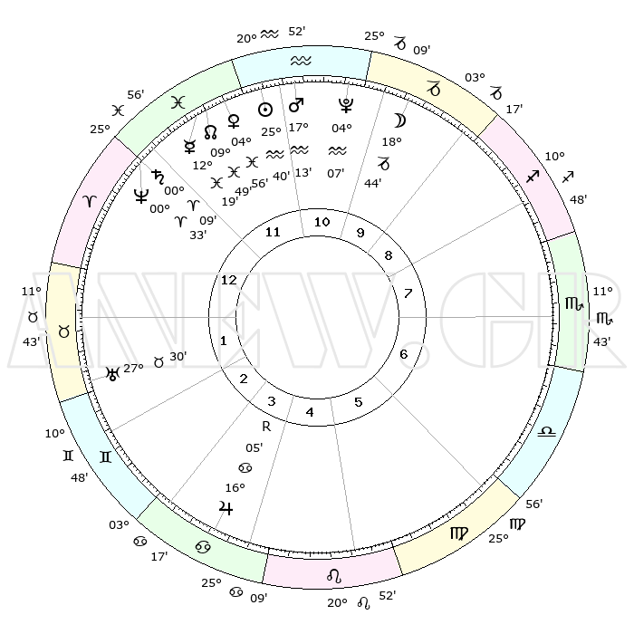 | | ΘΕΣΕΙΣ ΠΛΑΝΗΤΩΝ ΑΣΤΡΟΛΟΓΙΚΟΥ ΧΑΡΤΗ ΤΗΣ ΣΤΙΓΜΗΣ ΑΥΤΗΣ | | | | Πλανήτης | Ζώδιο | Μοίρες | Δεκαήμ. | Σε οίκο | Απόκλιση | | Ακμές των οίκων | | Ηλιος | Υδροχόος | 25°35' | Τρίτο | 12 | 12 S 59 | | 1ος | 01°16' | Κριός | | Σελήνη | Αιγόκερως | 17°50' | Δεύτερο | 10 | 26 S 19 | | 2ος | 11°15' | Ταύρος | | Ερμής | Ιχθείς | 12°13' | Δεύτερο | 12 | 07 S 04 | | 3ος | 08°27' | Δίδυμοι | | Αφροδίτη | Ιχθείς | 04°50' | Πρώτο | 12 | 11 S 06 | | 4ος | 00°42' | Καρκίνος | | Αρης | Υδροχόος | 17°10' | Δεύτερο | 11 | 16 S 43 | | 5ος | 23°04' | Καρκίνος | | Δίας | Καρκίνος | 16°05'R | Δεύτερο | 4 | 22 N 47 | | 6ος | 20°40' | Λέων | | Κρόνος | Κριός | 00°09' | Πρώτο | 12 | 01 S 55 | | 7ος | 01°16' | Ζυγός | | Ουρανός | Ταύρος | 27°30' | Τρίτο | 2 | 19 N 25 | | 8ος | 11°15' | Σκορπιός | | Ποσειδώνας | Κριός | 00°33' | Πρώτο | 12 | 00 S 59 | | 9ος | 08°27' | Τοξότης | | Πλούτωνας | Υδροχόος | 04°07' | Πρώτο | 11 | 22 S 57 | | 10ος | 00°42' | Αιγόκερως | | Β. Δεσμός | Ιχθείς | 09°49' | Πρώτο | 12 | 07 S 53 | | 11ος | 23°04' | Αιγόκερως | | Ωροσκόπος | Κριός | 01°16' | Πρώτο | | | 12ος | 20°40' | Υδροχόος | | Μεσουράνημα | Αιγόκερως | 00°42' | Πρώτο | | | |