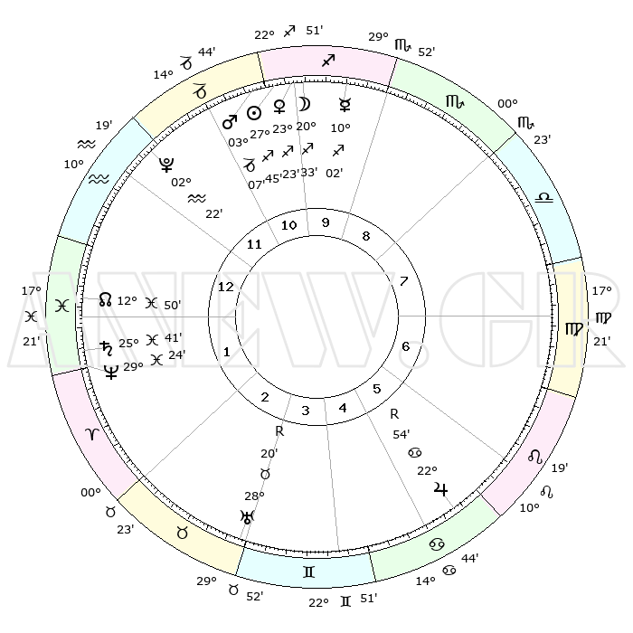 | | ΘΕΣΕΙΣ ΠΛΑΝΗΤΩΝ ΑΣΤΡΟΛΟΓΙΚΟΥ ΧΑΡΤΗ ΤΗΣ ΣΤΙΓΜΗΣ ΑΥΤΗΣ | | | | Πλανήτης | Ζώδιο | Μοίρες | Δεκαήμ. | Σε οίκο | Απόκλιση | | Ακμές των οίκων | | Ηλιος | Τοξότης | 27°22' | Τρίτο | 2 | 23 S 24 | | 1ος | 00°46' | Σκορπιός | | Σελήνη | Τοξότης | 16°05' | Δεύτερο | 2 | 27 S 40 | | 2ος | 29°14' | Σκορπιός | | Ερμής | Τοξότης | 09°30' | Πρώτο | 2 | 20 S 52 | | 3ος | 01°15' | Αιγόκερως | | Αφροδίτη | Τοξότης | 22°55' | Τρίτο | 2 | 23 S 15 | | 4ος | 05°29' | Υδροχόος | | Αρης | Αιγόκερως | 02°50' | Πρώτο | 3 | 24 S 12 | | 5ος | 08°24' | Ιχθείς | | Δίας | Καρκίνος | 22°56'R | Τρίτο | 9 | 21 N 41 | | 6ος | 06°60' | Κριός | | Κρόνος | Ιχθείς | 25°40' | Τρίτο | 5 | 03 S 50 | | 7ος | 00°46' | Ταύρος | | Ουρανός | Ταύρος | 28°21'R | Τρίτο | 7 | 19 N 35 | | 8ος | 29°14' | Ταύρος | | Ποσειδώνας | Ιχθείς | 29°24' | Τρίτο | 5 | 01 S 28 | | 9ος | 01°15' | Καρκίνος | | Πλούτωνας | Υδροχόος | 02°21' | Πρώτο | 3 | 23 S 18 | | 10ος | 05°29' | Λέων | | Β. Δεσμός | Ιχθείς | 12°51' | Δεύτερο | 5 | 06 S 44 | | 11ος | 08°24' | Παρθένος | | Ωροσκόπος | Σκορπιός | 00°46' | Πρώτο | | | 12ος | 06°60' | Ζυγός | | Μεσουράνημα | Λέων | 05°29' | Πρώτο | | | |