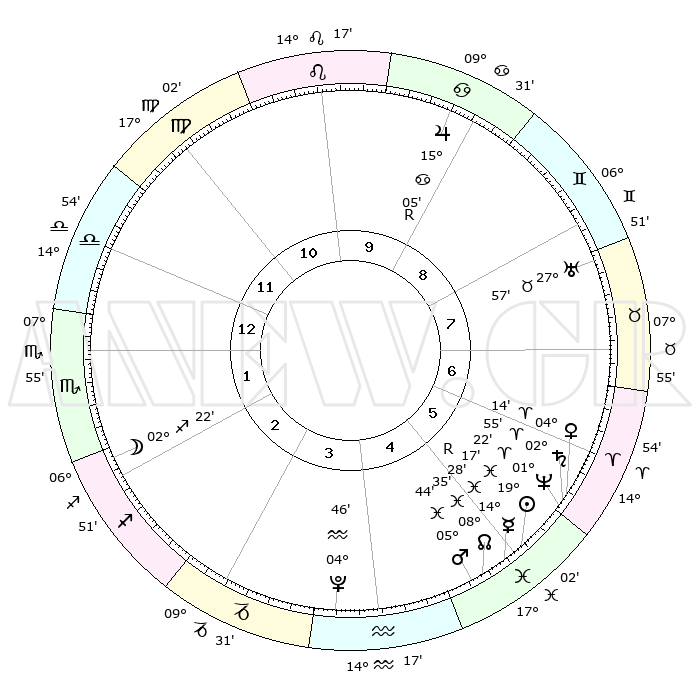 | | ΘΕΣΕΙΣ ΠΛΑΝΗΤΩΝ ΑΣΤΡΟΛΟΓΙΚΟΥ ΧΑΡΤΗ ΤΗΣ ΣΤΙΓΜΗΣ ΑΥΤΗΣ | | | | Πλανήτης | Ζώδιο | Μοίρες | Δεκαήμ. | Σε οίκο | Απόκλιση | | Ακμές των οίκων | | Ηλιος | Ιχθείς | 19°09' | Δεύτερο | 6 | 04 S 17 | | 1ος | 03°10' | Ζυγός | | Σελήνη | Τοξότης | 00°58' | Πρώτο | 3 | 25 S 27 | | 2ος | 29°59' | Ζυγός | | Ερμής | Ιχθείς | 14°35'R | Δεύτερο | 6 | 02 S 54 | | 3ος | 00°32' | Τοξότης | | Αφροδίτη | Κριός | 04°06' | Πρώτο | 7 | 00 N 32 | | 4ος | 03°34' | Αιγόκερως | | Αρης | Ιχθείς | 05°38' | Πρώτο | 5 | 10 S 28 | | 5ος | 06°31' | Υδροχόος | | Δίας | Καρκίνος | 15°05'R | Δεύτερο | 10 | 22 N 56 | | 6ος | 06°49' | Ιχθείς | | Κρόνος | Κριός | 02°54' | Πρώτο | 6 | 00 S 48 | | 7ος | 03°10' | Κριός | | Ουρανός | Ταύρος | 27°57' | Τρίτο | 8 | 19 N 32 | | 8ος | 29°59' | Κριός | | Ποσειδώνας | Κριός | 01°22' | Πρώτο | 6 | 00 S 39 | | 9ος | 00°32' | Δίδυμοι | | Πλούτωνας | Υδροχόος | 04°46' | Πρώτο | 4 | 22 S 50 | | 10ος | 03°34' | Καρκίνος | | Β. Δεσμός | Ιχθείς | 08°35' | Πρώτο | 6 | 08 S 21 | | 11ος | 06°31' | Λέων | | Ωροσκόπος | Ζυγός | 03°10' | Πρώτο | | | 12ος | 06°49' | Παρθένος | | Μεσουράνημα | Καρκίνος | 03°34' | Πρώτο | | | |