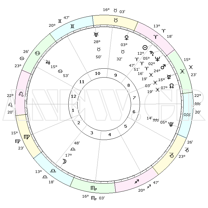 | | ΘΕΣΕΙΣ ΠΛΑΝΗΤΩΝ ΑΣΤΡΟΛΟΓΙΚΟΥ ΧΑΡΤΗ ΤΗΣ ΣΤΙΓΜΗΣ ΑΥΤΗΣ | | | | Πλανήτης | Ζώδιο | Μοίρες | Δεκαήμ. | Σε οίκο | Απόκλιση | | Ακμές των οίκων | | Ηλιος | Κριός | 12°43' | Δεύτερο | 9 | 05 N 01 | | 1ος | 02°13' | Λέων | | Σελήνη | Ζυγός | 16°56' | Δεύτερο | 3 | 09 S 37 | | 2ος | 23°24' | Λέων | | Ερμής | Ιχθείς | 14°59' | Δεύτερο | 8 | 07 S 19 | | 3ος | 18°45' | Παρθένος | | Αφροδίτη | Ταύρος | 03°27' | Πρώτο | 10 | 12 N 18 | | 4ος | 20°03' | Ζυγός | | Αρης | Ιχθείς | 24°16' | Τρίτο | 9 | 03 S 14 | | 5ος | 26°02' | Σκορπιός | | Δίας | Καρκίνος | 15°53' | Δεύτερο | 12 | 22 N 51 | | 6ος | 01°23' | Αιγόκερως | | Κρόνος | Κριός | 05°51' | Πρώτο | 9 | 00 N 22 | | 7ος | 02°13' | Υδροχόος | | Ουρανός | Ταύρος | 28°50' | Τρίτο | 11 | 19 N 44 | | 8ος | 23°24' | Υδροχόος | | Ποσειδώνας | Κριός | 02°16' | Πρώτο | 9 | 00 S 18 | | 9ος | 18°45' | Ιχθείς | | Πλούτωνας | Υδροχόος | 05°14' | Πρώτο | 7 | 22 S 47 | | 10ος | 20°03' | Κριός | | Β. Δεσμός | Ιχθείς | 07°20' | Πρώτο | 8 | 08 S 49 | | 11ος | 26°02' | Ταύρος | | Ωροσκόπος | Λέων | 02°13' | Πρώτο | | | 12ος | 01°23' | Καρκίνος | | Μεσουράνημα | Κριός | 20°03' | Τρίτο | | | |