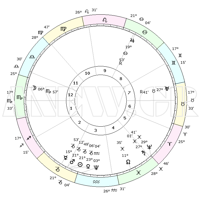 | | ΘΕΣΕΙΣ ΠΛΑΝΗΤΩΝ ΑΣΤΡΟΛΟΓΙΚΟΥ ΧΑΡΤΗ ΤΗΣ ΣΤΙΓΜΗΣ ΑΥΤΗΣ | | | | Πλανήτης | Ζώδιο | Μοίρες | Δεκαήμ. | Σε οίκο | Απόκλιση | | Ακμές των οίκων | | Ηλιος | Αιγόκερως | 21°43' | Τρίτο | 3 | 21 S 41 | | 1ος | 19°17' | Ζυγός | | Σελήνη | Σκορπιός | 05°48' | Πρώτο | 1 | 17 S 26 | | 2ος | 17°05' | Σκορπιός | | Ερμής | Αιγόκερως | 15°43' | Δεύτερο | 3 | 24 S 05 | | 3ος | 18°20' | Τοξότης | | Αφροδίτη | Αιγόκερως | 22°59' | Τρίτο | 4 | 22 S 21 | | 4ος | 21°54' | Αιγόκερως | | Αρης | Αιγόκερως | 21°07' | Τρίτο | 3 | 22 S 43 | | 5ος | 24°51' | Υδροχόος | | Δίας | Καρκίνος | 19°53'R | Δεύτερο | 9 | 22 N 13 | | 6ος | 24°21' | Ιχθείς | | Κρόνος | Ιχθείς | 27°01' | Τρίτο | 6 | 03 S 14 | | 7ος | 19°17' | Κριός | | Ουρανός | Ταύρος | 27°41'R | Τρίτο | 8 | 19 N 27 | | 8ος | 17°05' | Ταύρος | | Ποσειδώνας | Ιχθείς | 29°41' | Τρίτο | 6 | 01 S 21 | | 9ος | 18°20' | Δίδυμοι | | Πλούτωνας | Υδροχόος | 03°04' | Πρώτο | 4 | 23 S 09 | | 10ος | 21°54' | Καρκίνος | | Β. Δεσμός | Ιχθείς | 11°35' | Δεύτερο | 5 | 07 S 13 | | 11ος | 24°51' | Λέων | | Ωροσκόπος | Ζυγός | 19°17' | Δεύτερο | | | 12ος | 24°21' | Παρθένος | | Μεσουράνημα | Καρκίνος | 21°54' | Τρίτο | | | |