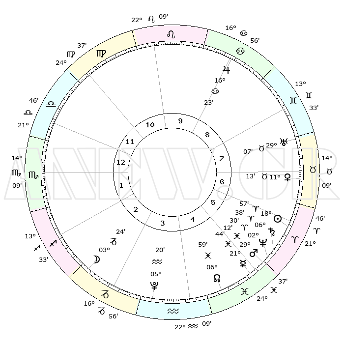 | | ΘΕΣΕΙΣ ΠΛΑΝΗΤΩΝ ΑΣΤΡΟΛΟΓΙΚΟΥ ΧΑΡΤΗ ΤΗΣ ΣΤΙΓΜΗΣ ΑΥΤΗΣ | | | | Πλανήτης | Ζώδιο | Μοίρες | Δεκαήμ. | Σε οίκο | Απόκλιση | | Ακμές των οίκων | | Ηλιος | Κριός | 18°54' | Δεύτερο | 6 | 07 N 24 | | 1ος | 27°13' | Ζυγός | | Σελήνη | Αιγόκερως | 02°42' | Πρώτο | 3 | 28 S 06 | | 2ος | 25°28' | Σκορπιός | | Ερμής | Ιχθείς | 21°39' | Τρίτο | 5 | 05 S 22 | | 3ος | 27°13' | Τοξότης | | Αφροδίτη | Ταύρος | 11°09' | Δεύτερο | 7 | 15 N 04 | | 4ος | 01°13' | Υδροχόος | | Αρης | Ιχθείς | 29°10' | Τρίτο | 5 | 01 S 16 | | 5ος | 04°10' | Ιχθείς | | Δίας | Καρκίνος | 16°22' | Δεύτερο | 9 | 22 N 48 | | 6ος | 03°05' | Κριός | | Κρόνος | Κριός | 06°37' | Πρώτο | 6 | 00 N 40 | | 7ος | 27°13' | Κριός | | Ουρανός | Ταύρος | 29°07' | Τρίτο | 8 | 19 N 47 | | 8ος | 25°28' | Ταύρος | | Ποσειδώνας | Κριός | 02°30' | Πρώτο | 5 | 00 S 13 | | 9ος | 27°13' | Δίδυμοι | | Πλούτωνας | Υδροχόος | 05°20' | Πρώτο | 4 | 22 S 47 | | 10ος | 01°13' | Λέων | | Β. Δεσμός | Ιχθείς | 06°60' | Πρώτο | 5 | 08 S 56 | | 11ος | 04°10' | Παρθένος | | Ωροσκόπος | Ζυγός | 27°13' | Τρίτο | | | 12ος | 03°04' | Ζυγός | | Μεσουράνημα | Λέων | 01°13' | Πρώτο | | | |