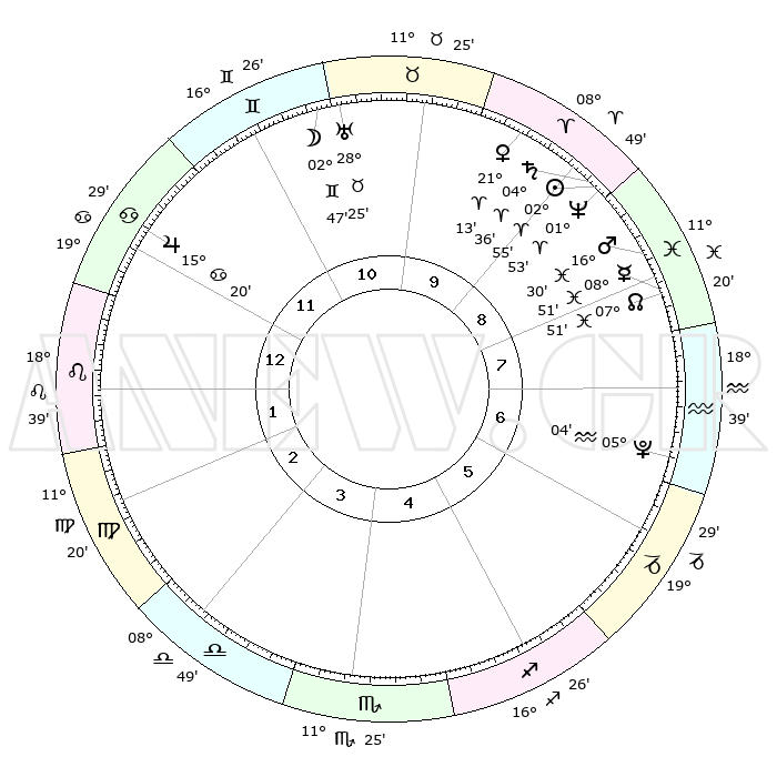 | | ΘΕΣΕΙΣ ΠΛΑΝΗΤΩΝ ΑΣΤΡΟΛΟΓΙΚΟΥ ΧΑΡΤΗ ΤΗΣ ΣΤΙΓΜΗΣ ΑΥΤΗΣ | | | | Πλανήτης | Ζώδιο | Μοίρες | Δεκαήμ. | Σε οίκο | Απόκλιση | | Ακμές των οίκων | | Ηλιος | Κριός | 02°50' | Πρώτο | 9 | 01 N 08 | | 1ος | 26°02' | Καρκίνος | | Σελήνη | Δίδυμοι | 01°40' | Πρώτο | 11 | 25 N 34 | | 2ος | 16°50' | Λέων | | Ερμής | Ιχθείς | 08°50' | Πρώτο | 8 | 07 S 56 | | 3ος | 11°21' | Παρθένος | | Αφροδίτη | Κριός | 21°07' | Τρίτο | 10 | 07 N 31 | | 4ος | 11°52' | Ζυγός | | Αρης | Ιχθείς | 16°26' | Δεύτερο | 9 | 06 S 20 | | 5ος | 17°58' | Σκορπιός | | Δίας | Καρκίνος | 15°20' | Δεύτερο | 12 | 22 N 55 | | 6ος | 24°20' | Τοξότης | | Κρόνος | Κριός | 04°36' | Πρώτο | 9 | 00 S 08 | | 7ος | 26°02' | Αιγόκερως | | Ουρανός | Ταύρος | 28°25' | Τρίτο | 11 | 19 N 38 | | 8ος | 16°50' | Υδροχόος | | Ποσειδώνας | Κριός | 01°53' | Πρώτο | 9 | 00 S 27 | | 9ος | 11°21' | Ιχθείς | | Πλούτωνας | Υδροχόος | 05°04' | Πρώτο | 7 | 22 S 48 | | 10ος | 11°52' | Κριός | | Β. Δεσμός | Ιχθείς | 07°51' | Πρώτο | 8 | 08 S 37 | | 11ος | 17°58' | Ταύρος | | Ωροσκόπος | Καρκίνος | 26°02' | Τρίτο | | | 12ος | 24°20' | Δίδυμοι | | Μεσουράνημα | Κριός | 11°52' | Δεύτερο | | | |