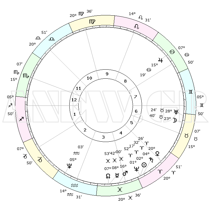 | | ΘΕΣΕΙΣ ΠΛΑΝΗΤΩΝ ΑΣΤΡΟΛΟΓΙΚΟΥ ΧΑΡΤΗ ΤΗΣ ΣΤΙΓΜΗΣ ΑΥΤΗΣ | | | | Πλανήτης | Ζώδιο | Μοίρες | Δεκαήμ. | Σε οίκο | Απόκλιση | | Ακμές των οίκων | | Ηλιος | Κριός | 02°12' | Πρώτο | 5 | 00 N 53 | | 1ος | 12°10' | Σκορπιός | | Σελήνη | Ταύρος | 22°29' | Τρίτο | 7 | 23 N 14 | | 2ος | 11°25' | Τοξότης | | Ερμής | Ιχθείς | 08°41' | Πρώτο | 4 | 07 S 51 | | 3ος | 14°33' | Αιγόκερως | | Αφροδίτη | Κριός | 20°20' | Τρίτο | 6 | 07 N 12 | | 4ος | 19°38' | Υδροχόος | | Αρης | Ιχθείς | 15°56' | Δεύτερο | 4 | 06 S 32 | | 5ος | 22°12' | Ιχθείς | | Δίας | Καρκίνος | 15°18' | Δεύτερο | 9 | 22 N 55 | | 6ος | 19°35' | Κριός | | Κρόνος | Κριός | 04°31' | Πρώτο | 5 | 00 S 09 | | 7ος | 12°10' | Ταύρος | | Ουρανός | Ταύρος | 28°23' | Τρίτο | 7 | 19 N 38 | | 8ος | 11°25' | Δίδυμοι | | Ποσειδώνας | Κριός | 01°52' | Πρώτο | 5 | 00 S 27 | | 9ος | 14°33' | Καρκίνος | | Πλούτωνας | Υδροχόος | 05°03' | Πρώτο | 3 | 22 S 48 | | 10ος | 19°38' | Λέων | | Β. Δεσμός | Ιχθείς | 07°53' | Πρώτο | 4 | 08 S 37 | | 11ος | 22°12' | Παρθένος | | Ωροσκόπος | Σκορπιός | 12°10' | Δεύτερο | | | 12ος | 19°35' | Ζυγός | | Μεσουράνημα | Λέων | 19°38' | Δεύτερο | | | |