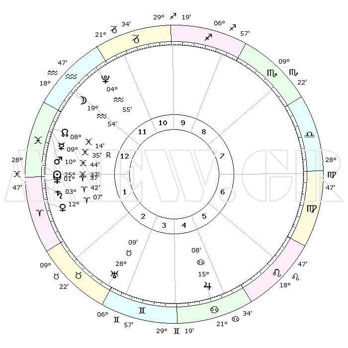 | | ΘΕΣΕΙΣ ΠΛΑΝΗΤΩΝ ΑΣΤΡΟΛΟΓΙΚΟΥ ΧΑΡΤΗ ΤΗΣ ΣΤΙΓΜΗΣ ΑΥΤΗΣ | | | | Πλανήτης | Ζώδιο | Μοίρες | Δεκαήμ. | Σε οίκο | Απόκλιση | | Ακμές των οίκων | | Ηλιος | Ιχθείς | 25°33' | Τρίτο | 1 | 01 S 46 | | 1ος | 23°57' | Υδροχόος | | Σελήνη | Υδροχόος | 19°06' | Δεύτερο | 12 | 16 S 48 | | 2ος | 09°43' | Κριός | | Ερμής | Ιχθείς | 09°37'R | Πρώτο | 1 | 05 S 58 | | 3ος | 13°38' | Ταύρος | | Αφροδίτη | Κριός | 12°03' | Δεύτερο | 2 | 03 N 50 | | 4ος | 08°40' | Δίδυμοι | | Αρης | Ιχθείς | 10°41' | Δεύτερο | 1 | 08 S 34 | | 5ος | 00°25' | Καρκίνος | | Δίας | Καρκίνος | 15°08' | Δεύτερο | 5 | 22 N 56 | | 6ος | 23°23' | Καρκίνος | | Κρόνος | Κριός | 03°41' | Πρώτο | 1 | 00 S 29 | | 7ος | 23°57' | Λέων | | Ουρανός | Ταύρος | 28°09' | Τρίτο | 3 | 19 N 34 | | 8ος | 09°43' | Ζυγός | | Ποσειδώνας | Κριός | 01°37' | Πρώτο | 1 | 00 S 33 | | 9ος | 13°38' | Σκορπιός | | Πλούτωνας | Υδροχόος | 04°55' | Πρώτο | 12 | 22 S 49 | | 10ος | 08°40' | Τοξότης | | Β. Δεσμός | Ιχθείς | 08°15' | Πρώτο | 1 | 08 S 29 | | 11ος | 00°25' | Αιγόκερως | | Ωροσκόπος | Υδροχόος | 23°57' | Τρίτο | | | 12ος | 23°23' | Αιγόκερως | | Μεσουράνημα | Τοξότης | 08°40' | Πρώτο | | | |