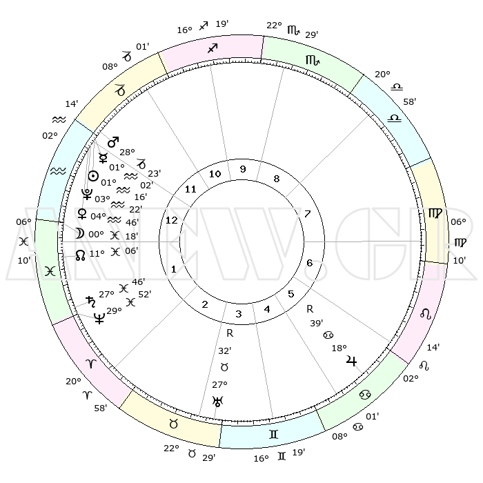 | | ΘΕΣΕΙΣ ΠΛΑΝΗΤΩΝ ΑΣΤΡΟΛΟΓΙΚΟΥ ΧΑΡΤΗ ΤΗΣ ΣΤΙΓΜΗΣ ΑΥΤΗΣ | | | | Πλανήτης | Ζώδιο | Μοίρες | Δεκαήμ. | Σε οίκο | Απόκλιση | | Ακμές των οίκων | | Ηλιος | Υδροχόος | 01°11' | Πρώτο | 1 | 19 S 53 | | 1ος | 28°48' | Αιγόκερως | | Σελήνη | Υδροχόος | 29°19' | Τρίτο | 1 | 12 S 33 | | 2ος | 12°42' | Ιχθείς | | Ερμής | Υδροχόος | 00°55' | Πρώτο | 1 | 21 S 57 | | 3ος | 21°20' | Κριός | | Αφροδίτη | Υδροχόος | 04°40' | Πρώτο | 1 | 20 S 12 | | 4ος | 20°00' | Ταύρος | | Αρης | Αιγόκερως | 28°20' | Τρίτο | 12 | 21 S 28 | | 5ος | 12°51' | Δίδυμοι | | Δίας | Καρκίνος | 18°39'R | Δεύτερο | 6 | 22 N 25 | | 6ος | 04°14' | Καρκίνος | | Κρόνος | Ιχθείς | 27°46' | Τρίτο | 2 | 02 S 55 | | 7ος | 28°48' | Καρκίνος | | Ουρανός | Ταύρος | 27°32'R | Τρίτο | 4 | 19 N 25 | | 8ος | 12°42' | Παρθένος | | Ποσειδώνας | Ιχθείς | 29°52' | Τρίτο | 2 | 01 S 16 | | 9ος | 21°20' | Ζυγός | | Πλούτωνας | Υδροχόος | 03°21' | Πρώτο | 1 | 23 S 05 | | 10ος | 20°00' | Σκορπιός | | Β. Δεσμός | Ιχθείς | 11°06' | Δεύτερο | 1 | 07 S 24 | | 11ος | 12°51' | Τοξότης | | Ωροσκόπος | Αιγόκερως | 28°48' | Τρίτο | | | 12ος | 04°14' | Αιγόκερως | | Μεσουράνημα | Σκορπιός | 20°00' | Τρίτο | | | |