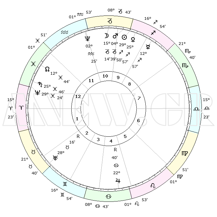 | | ΘΕΣΕΙΣ ΠΛΑΝΗΤΩΝ ΑΣΤΡΟΛΟΓΙΚΟΥ ΧΑΡΤΗ ΤΗΣ ΣΤΙΓΜΗΣ ΑΥΤΗΣ | | | | Πλανήτης | Ζώδιο | Μοίρες | Δεκαήμ. | Σε οίκο | Απόκλιση | | Ακμές των οίκων | | Ηλιος | Τοξότης | 29°27' | Τρίτο | 2 | 23 S 26 | | 1ος | 13°02' | Σκορπιός | | Σελήνη | Αιγόκερως | 10°38' | Δεύτερο | 2 | 27 S 23 | | 2ος | 12°20' | Τοξότης | | Ερμής | Τοξότης | 12°25' | Δεύτερο | 2 | 21 S 32 | | 3ος | 15°35' | Αιγόκερως | | Αφροδίτη | Τοξότης | 25°29' | Τρίτο | 2 | 23 S 26 | | 4ος | 20°43' | Υδροχόος | | Αρης | Αιγόκερως | 04°22' | Πρώτο | 2 | 24 S 11 | | 5ος | 23°15' | Ιχθείς | | Δίας | Καρκίνος | 22°42'R | Τρίτο | 9 | 21 N 44 | | 6ος | 20°32' | Κριός | | Κρόνος | Ιχθείς | 25°45' | Τρίτο | 5 | 03 S 48 | | 7ος | 13°02' | Ταύρος | | Ουρανός | Ταύρος | 28°17'R | Τρίτο | 7 | 19 N 35 | | 8ος | 12°20' | Δίδυμοι | | Ποσειδώνας | Ιχθείς | 29°24' | Τρίτο | 5 | 01 S 28 | | 9ος | 15°35' | Καρκίνος | | Πλούτωνας | Υδροχόος | 02°24' | Πρώτο | 3 | 23 S 17 | | 10ος | 20°43' | Λέων | | Β. Δεσμός | Ιχθείς | 12°45' | Δεύτερο | 4 | 06 S 46 | | 11ος | 23°15' | Παρθένος | | Ωροσκόπος | Σκορπιός | 13°02' | Δεύτερο | | | 12ος | 20°32' | Ζυγός | | Μεσουράνημα | Λέων | 20°43' | Τρίτο | | | |