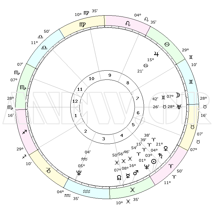 | | ΘΕΣΕΙΣ ΠΛΑΝΗΤΩΝ ΑΣΤΡΟΛΟΓΙΚΟΥ ΧΑΡΤΗ ΤΗΣ ΣΤΙΓΜΗΣ ΑΥΤΗΣ | | | | Πλανήτης | Ζώδιο | Μοίρες | Δεκαήμ. | Σε οίκο | Απόκλιση | | Ακμές των οίκων | | Ηλιος | Κριός | 03°11' | Πρώτο | 5 | 01 N 16 | | 1ος | 07°20' | Σκορπιός | | Σελήνη | Δίδυμοι | 06°40' | Πρώτο | 8 | 26 N 34 | | 2ος | 06°13' | Τοξότης | | Ερμής | Ιχθείς | 08°55' | Πρώτο | 4 | 07 S 58 | | 3ος | 08°50' | Αιγόκερως | | Αφροδίτη | Κριός | 21°33' | Τρίτο | 6 | 07 N 42 | | 4ος | 13°32' | Υδροχόος | | Αρης | Ιχθείς | 16°42' | Δεύτερο | 5 | 06 S 14 | | 5ος | 16°18' | Ιχθείς | | Δίας | Καρκίνος | 15°21' | Δεύτερο | 9 | 22 N 55 | | 6ος | 14°15' | Κριός | | Κρόνος | Κριός | 04°38' | Πρώτο | 5 | 00 S 06 | | 7ος | 07°20' | Ταύρος | | Ουρανός | Ταύρος | 28°26' | Τρίτο | 7 | 19 N 38 | | 8ος | 06°13' | Δίδυμοι | | Ποσειδώνας | Κριός | 01°54' | Πρώτο | 5 | 00 S 27 | | 9ος | 08°50' | Καρκίνος | | Πλούτωνας | Υδροχόος | 05°04' | Πρώτο | 3 | 22 S 48 | | 10ος | 13°32' | Λέων | | Β. Δεσμός | Ιχθείς | 07°50' | Πρώτο | 4 | 08 S 38 | | 11ος | 16°18' | Παρθένος | | Ωροσκόπος | Σκορπιός | 07°20' | Πρώτο | | | 12ος | 14°15' | Ζυγός | | Μεσουράνημα | Λέων | 13°32' | Δεύτερο | | | |