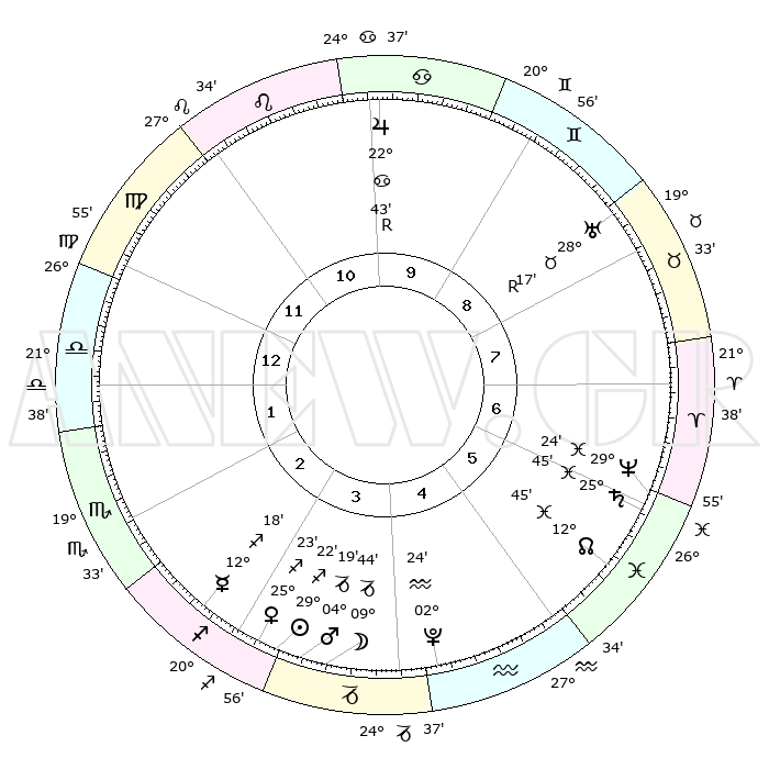 | | ΘΕΣΕΙΣ ΠΛΑΝΗΤΩΝ ΑΣΤΡΟΛΟΓΙΚΟΥ ΧΑΡΤΗ ΤΗΣ ΣΤΙΓΜΗΣ ΑΥΤΗΣ | | | | Πλανήτης | Ζώδιο | Μοίρες | Δεκαήμ. | Σε οίκο | Απόκλιση | | Ακμές των οίκων | | Ηλιος | Τοξότης | 29°17' | Τρίτο | 4 | 23 S 26 | | 1ος | 26°29' | Παρθένος | | Σελήνη | Αιγόκερως | 08°42' | Πρώτο | 4 | 27 S 36 | | 2ος | 22°49' | Ζυγός | | Ερμής | Τοξότης | 12°11' | Δεύτερο | 3 | 21 S 29 | | 3ος | 23°07' | Σκορπιός | | Αφροδίτη | Τοξότης | 25°17' | Τρίτο | 3 | 23 S 25 | | 4ος | 26°03' | Τοξότης | | Αρης | Αιγόκερως | 04°15' | Πρώτο | 4 | 24 S 11 | | 5ος | 29°05' | Αιγόκερως | | Δίας | Καρκίνος | 22°43'R | Τρίτο | 10 | 21 N 44 | | 6ος | 29°39' | Υδροχόος | | Κρόνος | Ιχθείς | 25°44' | Τρίτο | 6 | 03 S 48 | | 7ος | 26°29' | Ιχθείς | | Ουρανός | Ταύρος | 28°17'R | Τρίτο | 9 | 19 N 35 | | 8ος | 22°49' | Κριός | | Ποσειδώνας | Ιχθείς | 29°24' | Τρίτο | 7 | 01 S 28 | | 9ος | 23°07' | Ταύρος | | Πλούτωνας | Υδροχόος | 02°24' | Πρώτο | 5 | 23 S 17 | | 10ος | 26°03' | Δίδυμοι | | Β. Δεσμός | Ιχθείς | 12°45' | Δεύτερο | 6 | 06 S 46 | | 11ος | 29°05' | Καρκίνος | | Ωροσκόπος | Παρθένος | 26°29' | Τρίτο | | | 12ος | 29°39' | Λέων | | Μεσουράνημα | Δίδυμοι | 26°03' | Τρίτο | | | |