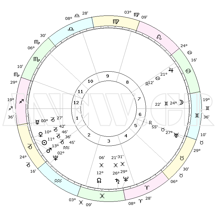 | | ΘΕΣΕΙΣ ΠΛΑΝΗΤΩΝ ΑΣΤΡΟΛΟΓΙΚΟΥ ΧΑΡΤΗ ΤΗΣ ΣΤΙΓΜΗΣ ΑΥΤΗΣ | | | | Πλανήτης | Ζώδιο | Μοίρες | Δεκαήμ. | Σε οίκο | Απόκλιση | | Ακμές των οίκων | | Ηλιος | Αιγόκερως | 11°41' | Δεύτερο | 2 | 22 S 55 | | 1ος | 27°09' | Σκορπιός | | Σελήνη | Δίδυμοι | 23°14' | Τρίτο | 7 | 28 N 12 | | 2ος | 27°55' | Τοξότης | | Ερμής | Αιγόκερως | 00°21' | Πρώτο | 2 | 24 S 07 | | 3ος | 03°09' | Υδροχόος | | Αφροδίτη | Αιγόκερως | 10°36' | Δεύτερο | 2 | 23 S 33 | | 4ος | 09°07' | Ιχθείς | | Αρης | Αιγόκερως | 13°32' | Δεύτερο | 2 | 23 S 38 | | 5ος | 10°29' | Κριός | | Δίας | Καρκίνος | 21°12'R | Τρίτο | 8 | 22 N 00 | | 6ος | 05°55' | Ταύρος | | Κρόνος | Ιχθείς | 26°21' | Τρίτο | 4 | 03 S 31 | | 7ος | 27°09' | Ταύρος | | Ουρανός | Ταύρος | 27°55'R | Τρίτο | 7 | 19 N 30 | | 8ος | 27°55' | Δίδυμοι | | Ποσειδώνας | Ιχθείς | 29°31' | Τρίτο | 4 | 01 S 25 | | 9ος | 03°09' | Λέων | | Πλούτωνας | Υδροχόος | 02°45' | Πρώτο | 2 | 23 S 13 | | 10ος | 09°07' | Παρθένος | | Β. Δεσμός | Ιχθείς | 12°07' | Δεύτερο | 4 | 07 S 01 | | 11ος | 10°29' | Ζυγός | | Ωροσκόπος | Σκορπιός | 27°09' | Τρίτο | | | 12ος | 05°55' | Σκορπιός | | Μεσουράνημα | Παρθένος | 09°07' | Πρώτο | | | |