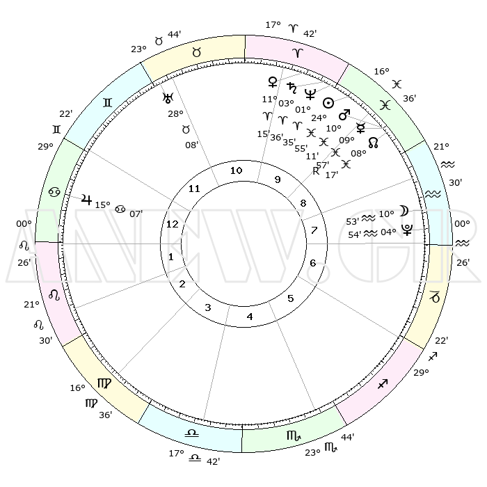 | | ΘΕΣΕΙΣ ΠΛΑΝΗΤΩΝ ΑΣΤΡΟΛΟΓΙΚΟΥ ΧΑΡΤΗ ΤΗΣ ΣΤΙΓΜΗΣ ΑΥΤΗΣ | | | | Πλανήτης | Ζώδιο | Μοίρες | Δεκαήμ. | Σε οίκο | Απόκλιση | | Ακμές των οίκων | | Ηλιος | Ιχθείς | 24°51' | Τρίτο | 10 | 02 S 03 | | 1ος | 12°48' | Καρκίνος | | Σελήνη | Υδροχόος | 10°08' | Δεύτερο | 8 | 20 S 09 | | 2ος | 03°13' | Λέων | | Ερμής | Ιχθείς | 09°59'R | Πρώτο | 9 | 05 S 41 | | 3ος | 26°07' | Λέων | | Αφροδίτη | Κριός | 11°11' | Δεύτερο | 10 | 03 N 28 | | 4ος | 24°34' | Παρθένος | | Αρης | Ιχθείς | 10°08' | Δεύτερο | 9 | 08 S 46 | | 5ος | 00°06' | Σκορπιός | | Δίας | Καρκίνος | 15°07' | Δεύτερο | 1 | 22 N 56 | | 6ος | 08°39' | Τοξότης | | Κρόνος | Κριός | 03°36' | Πρώτο | 10 | 00 S 31 | | 7ος | 12°48' | Αιγόκερως | | Ουρανός | Ταύρος | 28°08' | Τρίτο | 11 | 19 N 34 | | 8ος | 03°13' | Υδροχόος | | Ποσειδώνας | Κριός | 01°35' | Πρώτο | 10 | 00 S 34 | | 9ος | 26°07' | Υδροχόος | | Πλούτωνας | Υδροχόος | 04°54' | Πρώτο | 8 | 22 S 49 | | 10ος | 24°34' | Ιχθείς | | Β. Δεσμός | Ιχθείς | 08°17' | Πρώτο | 9 | 08 S 28 | | 11ος | 00°06' | Ταύρος | | Ωροσκόπος | Καρκίνος | 12°48' | Δεύτερο | | | 12ος | 08°39' | Δίδυμοι | | Μεσουράνημα | Ιχθείς | 24°34' | Τρίτο | | | |