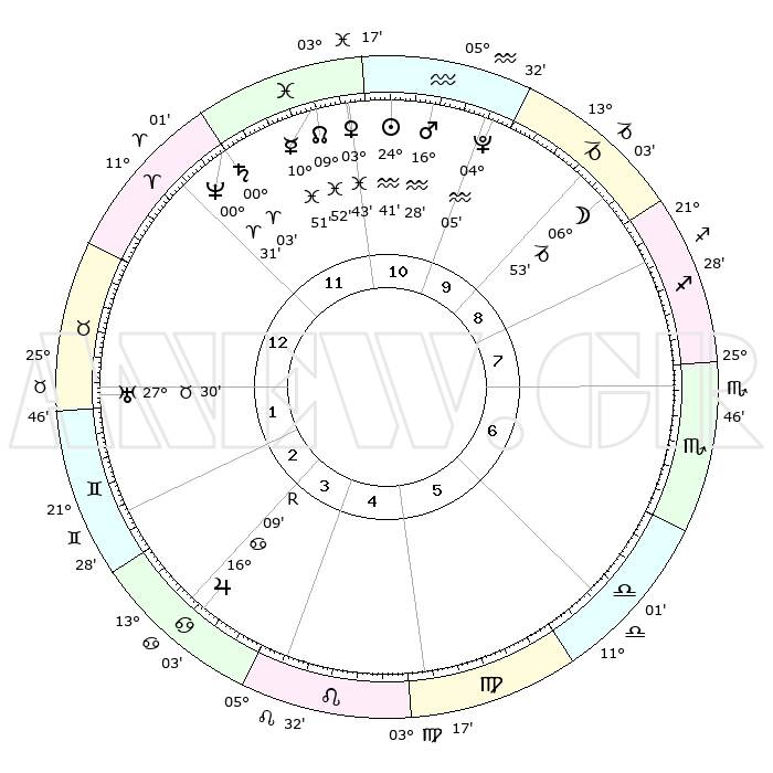 | | ΘΕΣΕΙΣ ΠΛΑΝΗΤΩΝ ΑΣΤΡΟΛΟΓΙΚΟΥ ΧΑΡΤΗ ΤΗΣ ΣΤΙΓΜΗΣ ΑΥΤΗΣ | | | | Πλανήτης | Ζώδιο | Μοίρες | Δεκαήμ. | Σε οίκο | Απόκλιση | | Ακμές των οίκων | | Ηλιος | Υδροχόος | 24°37' | Τρίτο | 11 | 13 S 19 | | 1ος | 26°28' | Κριός | | Σελήνη | Αιγόκερως | 06°10' | Πρώτο | 9 | 27 S 58 | | 2ος | 29°40' | Ταύρος | | Ερμής | Ιχθείς | 10°45' | Δεύτερο | 11 | 07 S 49 | | 3ος | 23°36' | Δίδυμοι | | Αφροδίτη | Ιχθείς | 03°39' | Πρώτο | 11 | 11 S 32 | | 4ος | 15°17' | Καρκίνος | | Αρης | Υδροχόος | 16°25' | Δεύτερο | 11 | 16 S 56 | | 5ος | 09°21' | Λέων | | Δίας | Καρκίνος | 16°09'R | Δεύτερο | 4 | 22 N 47 | | 6ος | 11°22' | Παρθένος | | Κρόνος | Κριός | 00°02' | Πρώτο | 12 | 01 S 57 | | 7ος | 26°28' | Ζυγός | | Ουρανός | Ταύρος | 27°30' | Τρίτο | 1 | 19 N 25 | | 8ος | 29°40' | Σκορπιός | | Ποσειδώνας | Κριός | 00°31' | Πρώτο | 12 | 01 S 00 | | 9ος | 23°36' | Τοξότης | | Πλούτωνας | Υδροχόος | 04°05' | Πρώτο | 10 | 22 S 57 | | 10ος | 15°17' | Αιγόκερως | | Β. Δεσμός | Ιχθείς | 09°53' | Πρώτο | 11 | 07 S 52 | | 11ος | 09°21' | Υδροχόος | | Ωροσκόπος | Κριός | 26°28' | Τρίτο | | | 12ος | 11°22' | Ιχθείς | | Μεσουράνημα | Αιγόκερως | 15°17' | Δεύτερο | | | |