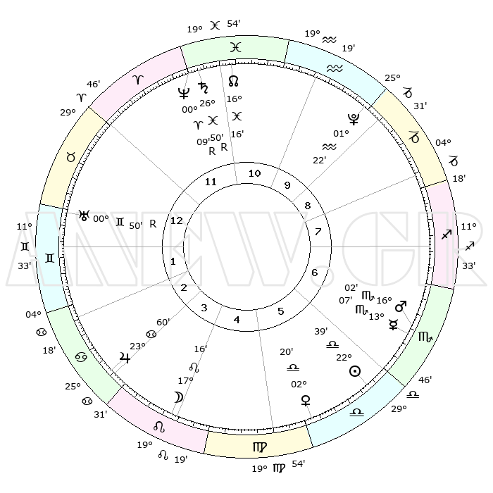 | ΘΕΣΕΙΣ ΠΛΑΝΗΤΩΝ ΑΣΤΡΟΛΟΓΙΚΟΥ ΧΑΡΤΗ ΤΗΣ ΣΤΙΓΜΗΣ ΑΥΤΗΣ | | Πλανήτης | Ζώδιο | Μοίρες | Δεκαήμ. | Σε οίκο | Απόκλιση | | Ακμές των οίκων | Ηλιος | Ζυγός | 22°32' | Τρίτο | 7 | 08 S 46 | | 1ος | 17°12' | Κριός | Σελήνη | Λέων | 15°47' | Δεύτερο | 5 | 18 N 45 | | 2ος | 22°59' | Ταύρος | Ερμής | Σκορπιός | 12°58' | Δεύτερο | 7 | 17 S 26 | | 3ος | 17°60' | Δίδυμοι | Αφροδίτη | Ζυγός | 02°12' | Πρώτο | 6 | 00 N 31 | | 4ος | 09°46' | Καρκίνος | Αρης | Σκορπιός | 15°57' | Δεύτερο | 7 | 16 S 50 | | 5ος | 03°04' | Λέων | Δίας | Καρκίνος | 23°59' | Τρίτο | 4 | 21 N 21 | | 6ος | 03°21' | Παρθένος | Κρόνος | Ιχθείς | 26°51'R | Τρίτο | 12 | 03 S 33 | | 7ος | 17°12' | Ζυγός | Ουρανός | Δίδυμοι | 00°50'R | Πρώτο | 2 | 20 N 07 | | 8ος | 22°59' | Σκορπιός | Ποσειδώνας | Κριός | 00°10'R | Πρώτο | 12 | 01 S 12 | | 9ος | 17°60' | Τοξότης | Πλούτωνας | Υδροχόος | 01°22' | Πρώτο | 10 | 23 S 32 | | 10ος | 09°46' | Αιγόκερως | Β. Δεσμός | Ιχθείς | 16°16' | Δεύτερο | 12 | 05 S 25 | | 11ος | 03°04' | Υδροχόος | Ωροσκόπος | Κριός | 17°12' | Δεύτερο | | | 12ος | 03°21' | Ιχθείς | Μεσουράνημα | Αιγόκερως | 09°46' | Πρώτο | | | |