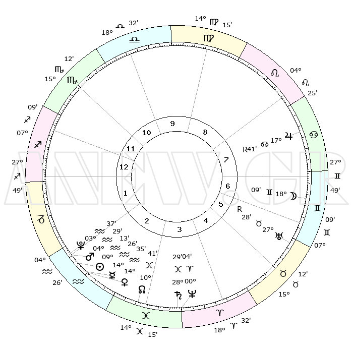 | | ΘΕΣΕΙΣ ΠΛΑΝΗΤΩΝ ΑΣΤΡΟΛΟΓΙΚΟΥ ΧΑΡΤΗ ΤΗΣ ΣΤΙΓΜΗΣ ΑΥΤΗΣ | | | | Πλανήτης | Ζώδιο | Μοίρες | Δεκαήμ. | Σε οίκο | Απόκλιση | | Ακμές των οίκων | | Ηλιος | Υδροχόος | 09°08' | Πρώτο | 2 | 17 S 58 | | 1ος | 05°08' | Τοξότης | | Σελήνη | Δίδυμοι | 17°05' | Δεύτερο | 7 | 27 N 56 | | 2ος | 07°01' | Αιγόκερως | | Ερμής | Υδροχόος | 14°18' | Δεύτερο | 3 | 18 S 28 | | 3ος | 13°36' | Υδροχόος | | Αφροδίτη | Υδροχόος | 14°29' | Δεύτερο | 3 | 17 S 44 | | 4ος | 19°41' | Ιχθείς | | Αρης | Υδροχόος | 04°26' | Πρώτο | 2 | 20 S 09 | | 5ος | 20°02' | Κριός | | Δίας | Καρκίνος | 17°42'R | Δεύτερο | 8 | 22 N 34 | | 6ος | 14°24' | Ταύρος | | Κρόνος | Ιχθείς | 28°28' | Τρίτο | 4 | 02 S 37 | | 7ος | 05°08' | Δίδυμοι | | Ουρανός | Ταύρος | 27°28'R | Τρίτο | 6 | 19 N 24 | | 8ος | 07°02' | Καρκίνος | | Ποσειδώνας | Κριός | 00°04' | Πρώτο | 4 | 01 S 11 | | 9ος | 13°36' | Λέων | | Πλούτωνας | Υδροχόος | 03°36' | Πρώτο | 2 | 23 S 02 | | 10ος | 19°41' | Παρθένος | | Β. Δεσμός | Ιχθείς | 10°41' | Δεύτερο | 3 | 07 S 34 | | 11ος | 20°02' | Ζυγός | | Ωροσκόπος | Τοξότης | 05°08' | Πρώτο | | | 12ος | 14°24' | Σκορπιός | | Μεσουράνημα | Παρθένος | 19°41' | Δεύτερο | | | |