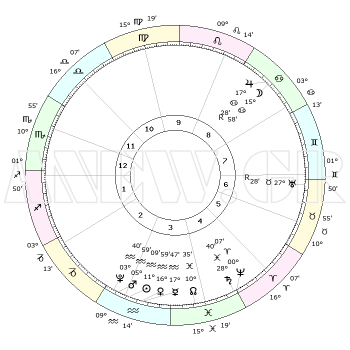 | | ΘΕΣΕΙΣ ΠΛΑΝΗΤΩΝ ΑΣΤΡΟΛΟΓΙΚΟΥ ΧΑΡΤΗ ΤΗΣ ΣΤΙΓΜΗΣ ΑΥΤΗΣ | | | | Πλανήτης | Ζώδιο | Μοίρες | Δεκαήμ. | Σε οίκο | Απόκλιση | | Ακμές των οίκων | | Ηλιος | Υδροχόος | 11°05' | Δεύτερο | 3 | 17 S 27 | | 1ος | 13°40' | Σκορπιός | | Σελήνη | Καρκίνος | 15°04' | Δεύτερο | 8 | 26 N 47 | | 2ος | 13°02' | Τοξότης | | Ερμής | Υδροχόος | 17°41' | Δεύτερο | 3 | 17 S 23 | | 3ος | 16°21' | Αιγόκερως | | Αφροδίτη | Υδροχόος | 16°54' | Δεύτερο | 3 | 17 S 03 | | 4ος | 21°32' | Υδροχόος | | Αρης | Υδροχόος | 05°56' | Πρώτο | 3 | 19 S 47 | | 5ος | 24°02' | Ιχθείς | | Δίας | Καρκίνος | 17°28'R | Δεύτερο | 9 | 22 N 36 | | 6ος | 21°14' | Κριός | | Κρόνος | Ιχθείς | 28°39' | Τρίτο | 5 | 02 S 32 | | 7ος | 13°40' | Ταύρος | | Ουρανός | Ταύρος | 27°28'R | Τρίτο | 7 | 19 N 24 | | 8ος | 13°02' | Δίδυμοι | | Ποσειδώνας | Κριός | 00°07' | Πρώτο | 5 | 01 S 10 | | 9ος | 16°21' | Καρκίνος | | Πλούτωνας | Υδροχόος | 03°40' | Πρώτο | 3 | 23 S 02 | | 10ος | 21°32' | Λέων | | Β. Δεσμός | Ιχθείς | 10°35' | Δεύτερο | 4 | 07 S 36 | | 11ος | 24°02' | Παρθένος | | Ωροσκόπος | Σκορπιός | 13°40' | Δεύτερο | | | 12ος | 21°14' | Ζυγός | | Μεσουράνημα | Λέων | 21°32' | Τρίτο | | | |