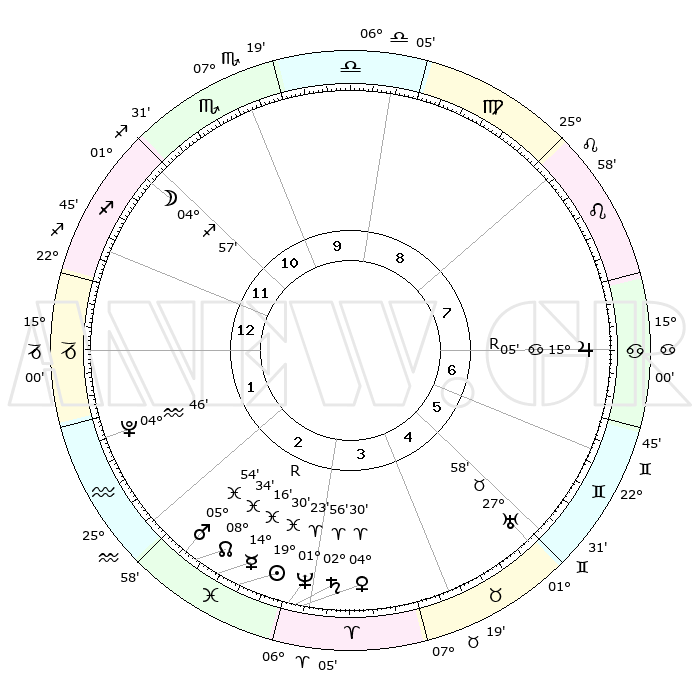 | | ΘΕΣΕΙΣ ΠΛΑΝΗΤΩΝ ΑΣΤΡΟΛΟΓΙΚΟΥ ΧΑΡΤΗ ΤΗΣ ΣΤΙΓΜΗΣ ΑΥΤΗΣ | | | | Πλανήτης | Ζώδιο | Μοίρες | Δεκαήμ. | Σε οίκο | Απόκλιση | | Ακμές των οίκων | | Ηλιος | Ιχθείς | 19°26' | Δεύτερο | 3 | 04 S 11 | | 1ος | 25°38' | Τοξότης | | Σελήνη | Τοξότης | 04°17' | Πρώτο | 11 | 26 S 09 | | 2ος | 01°42' | Υδροχόος | | Ερμής | Ιχθείς | 14°19'R | Δεύτερο | 3 | 03 S 03 | | 3ος | 11°19' | Ιχθείς | | Αφροδίτη | Κριός | 04°26' | Πρώτο | 3 | 00 N 41 | | 4ος | 15°54' | Κριός | | Αρης | Ιχθείς | 05°51' | Πρώτο | 2 | 10 S 23 | | 5ος | 12°56' | Ταύρος | | Δίας | Καρκίνος | 15°05'R | Δεύτερο | 7 | 22 N 56 | | 6ος | 05°03' | Δίδυμοι | | Κρόνος | Κριός | 02°56' | Πρώτο | 3 | 00 S 47 | | 7ος | 25°38' | Δίδυμοι | | Ουρανός | Ταύρος | 27°58' | Τρίτο | 5 | 19 N 32 | | 8ος | 01°42' | Λέων | | Ποσειδώνας | Κριός | 01°23' | Πρώτο | 3 | 00 S 39 | | 9ος | 11°19' | Παρθένος | | Πλούτωνας | Υδροχόος | 04°46' | Πρώτο | 2 | 22 S 50 | | 10ος | 15°54' | Ζυγός | | Β. Δεσμός | Ιχθείς | 08°34' | Πρώτο | 2 | 08 S 21 | | 11ος | 12°56' | Σκορπιός | | Ωροσκόπος | Τοξότης | 25°38' | Τρίτο | | | 12ος | 05°03' | Τοξότης | | Μεσουράνημα | Ζυγός | 15°54' | Δεύτερο | | | |