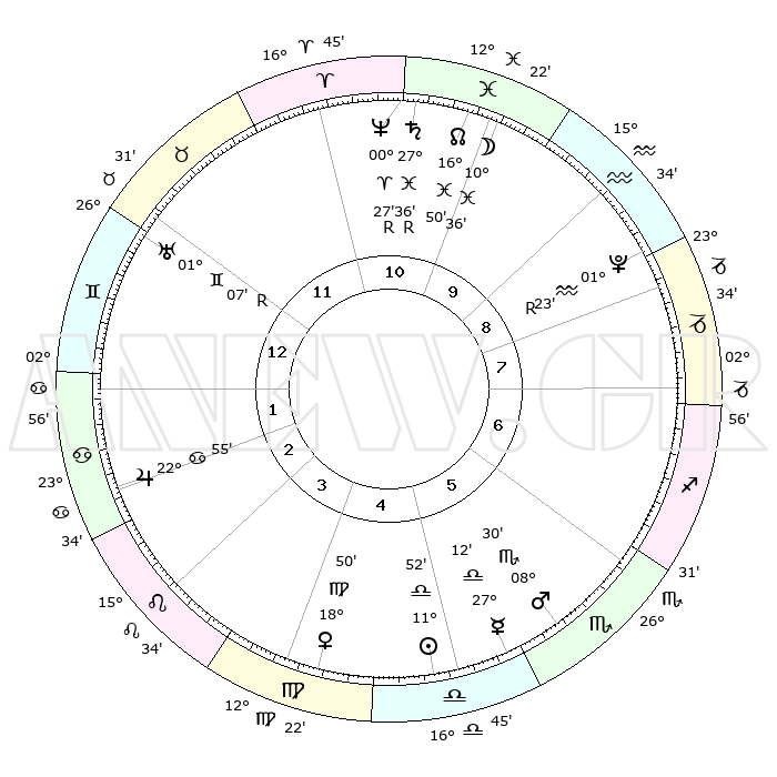 | ΘΕΣΕΙΣ ΠΛΑΝΗΤΩΝ ΑΣΤΡΟΛΟΓΙΚΟΥ ΧΑΡΤΗ ΤΗΣ ΣΤΙΓΜΗΣ ΑΥΤΗΣ | | Πλανήτης | Ζώδιο | Μοίρες | Δεκαήμ. | Σε οίκο | Απόκλιση | | Ακμές των οίκων | Ηλιος | Ζυγός | 11°46' | Δεύτερο | 6 | 04 S 39 | | 1ος | 22°39' | Ταύρος | Σελήνη | Ιχθείς | 09°07' | Πρώτο | 11 | 08 S 56 | | 2ος | 19°02' | Δίδυμοι | Ερμής | Ζυγός | 27°03' | Τρίτο | 6 | 10 S 56 | | 3ος | 10°48' | Καρκίνος | Αφροδίτη | Παρθένος | 18°42' | Δεύτερο | 5 | 05 N 44 | | 4ος | 03°05' | Λέων | Αρης | Σκορπιός | 08°26' | Πρώτο | 6 | 14 S 25 | | 5ος | 00°21' | Παρθένος | Δίας | Καρκίνος | 22°54' | Τρίτο | 3 | 21 N 31 | | 6ος | 07°32' | Ζυγός | Κρόνος | Ιχθείς | 27°36'R | Τρίτο | 11 | 03 S 15 | | 7ος | 22°39' | Σκορπιός | Ουρανός | Δίδυμοι | 01°08'R | Πρώτο | 1 | 20 N 10 | | 8ος | 19°02' | Τοξότης | Ποσειδώνας | Κριός | 00°27'R | Πρώτο | 11 | 01 S 05 | | 9ος | 10°48' | Αιγόκερως | Πλούτωνας | Υδροχόος | 01°23'R | Πρώτο | 9 | 23 S 32 | | 10ος | 03°05' | Υδροχόος | Β. Δεσμός | Ιχθείς | 16°51' | Δεύτερο | 11 | 05 S 12 | | 11ος | 00°21' | Ιχθείς | Ωροσκόπος | Ταύρος | 22°39' | Τρίτο | | | 12ος | 07°32' | Κριός | Μεσουράνημα | Υδροχόος | 03°05' | Πρώτο | | | |