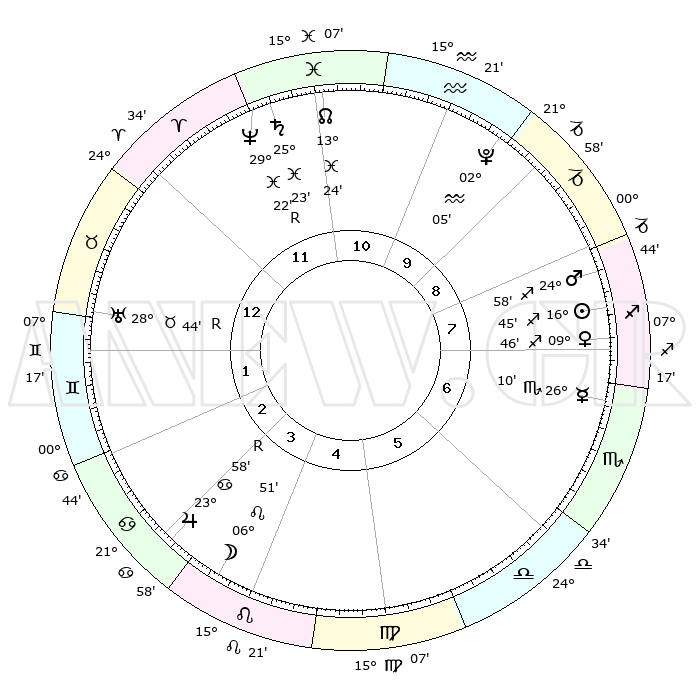 | | ΘΕΣΕΙΣ ΠΛΑΝΗΤΩΝ ΑΣΤΡΟΛΟΓΙΚΟΥ ΧΑΡΤΗ ΤΗΣ ΣΤΙΓΜΗΣ ΑΥΤΗΣ | | | | Πλανήτης | Ζώδιο | Μοίρες | Δεκαήμ. | Σε οίκο | Απόκλιση | | Ακμές των οίκων | | Ηλιος | Τοξότης | 16°42' | Δεύτερο | 8 | 22 S 46 | | 1ος | 18°20' | Ταύρος | | Σελήνη | Λέων | 06°14' | Πρώτο | 4 | 21 N 38 | | 2ος | 15°44' | Δίδυμοι | | Ερμής | Σκορπιός | 26°07' | Τρίτο | 7 | 17 S 04 | | 3ος | 07°45' | Καρκίνος | | Αφροδίτη | Τοξότης | 09°43' | Πρώτο | 7 | 21 S 29 | | 4ος | 29°51' | Καρκίνος | | Αρης | Τοξότης | 24°56' | Τρίτο | 8 | 24 S 04 | | 5ος | 26°27' | Λέων | | Δίας | Καρκίνος | 23°58'R | Τρίτο | 3 | 21 N 29 | | 6ος | 02°49' | Ζυγός | | Κρόνος | Ιχθείς | 25°23' | Τρίτο | 11 | 03 S 59 | | 7ος | 18°20' | Σκορπιός | | Ουρανός | Ταύρος | 28°45'R | Τρίτο | 1 | 19 N 41 | | 8ος | 15°44' | Τοξότης | | Ποσειδώνας | Ιχθείς | 29°22'R | Τρίτο | 11 | 01 S 29 | | 9ος | 07°45' | Αιγόκερως | | Πλούτωνας | Υδροχόος | 02°05' | Πρώτο | 10 | 23 S 22 | | 10ος | 29°51' | Αιγόκερως | | Β. Δεσμός | Ιχθείς | 13°25' | Δεύτερο | 11 | 06 S 31 | | 11ος | 26°27' | Υδροχόος | | Ωροσκόπος | Ταύρος | 18°20' | Δεύτερο | | | 12ος | 02°50' | Κριός | | Μεσουράνημα | Αιγόκερως | 29°51' | Τρίτο | | | |