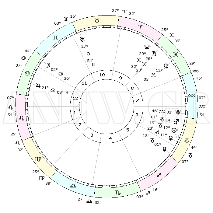 | | ΘΕΣΕΙΣ ΠΛΑΝΗΤΩΝ ΑΣΤΡΟΛΟΓΙΚΟΥ ΧΑΡΤΗ ΤΗΣ ΣΤΙΓΜΗΣ ΑΥΤΗΣ | | | | Πλανήτης | Ζώδιο | Μοίρες | Δεκαήμ. | Σε οίκο | Απόκλιση | | Ακμές των οίκων | | Ηλιος | Αιγόκερως | 12°14' | Δεύτερο | 7 | 22 S 52 | | 1ος | 12°08' | Καρκίνος | | Σελήνη | Καρκίνος | 01°18' | Πρώτο | 12 | 28 N 10 | | 2ος | 02°33' | Λέων | | Ερμής | Αιγόκερως | 01°10' | Πρώτο | 6 | 24 S 11 | | 3ος | 25°23' | Λέων | | Αφροδίτη | Αιγόκερως | 11°16' | Δεύτερο | 6 | 23 S 31 | | 4ος | 23°43' | Παρθένος | | Αρης | Αιγόκερως | 13°57' | Δεύτερο | 7 | 23 S 36 | | 5ος | 29°12' | Ζυγός | | Δίας | Καρκίνος | 21°08'R | Τρίτο | 1 | 22 N 01 | | 6ος | 07°51' | Τοξότης | | Κρόνος | Ιχθείς | 26°23' | Τρίτο | 10 | 03 S 30 | | 7ος | 12°08' | Αιγόκερως | | Ουρανός | Ταύρος | 27°54'R | Τρίτο | 11 | 19 N 30 | | 8ος | 02°33' | Υδροχόος | | Ποσειδώνας | Ιχθείς | 29°32' | Τρίτο | 10 | 01 S 25 | | 9ος | 25°23' | Υδροχόος | | Πλούτωνας | Υδροχόος | 02°46' | Πρώτο | 8 | 23 S 12 | | 10ος | 23°43' | Ιχθείς | | Β. Δεσμός | Ιχθείς | 12°05' | Δεύτερο | 9 | 07 S 02 | | 11ος | 29°12' | Κριός | | Ωροσκόπος | Καρκίνος | 12°08' | Δεύτερο | | | 12ος | 07°51' | Δίδυμοι | | Μεσουράνημα | Ιχθείς | 23°43' | Τρίτο | | | |